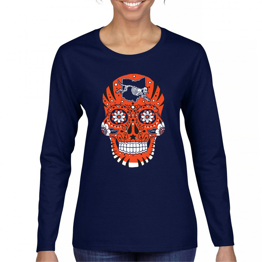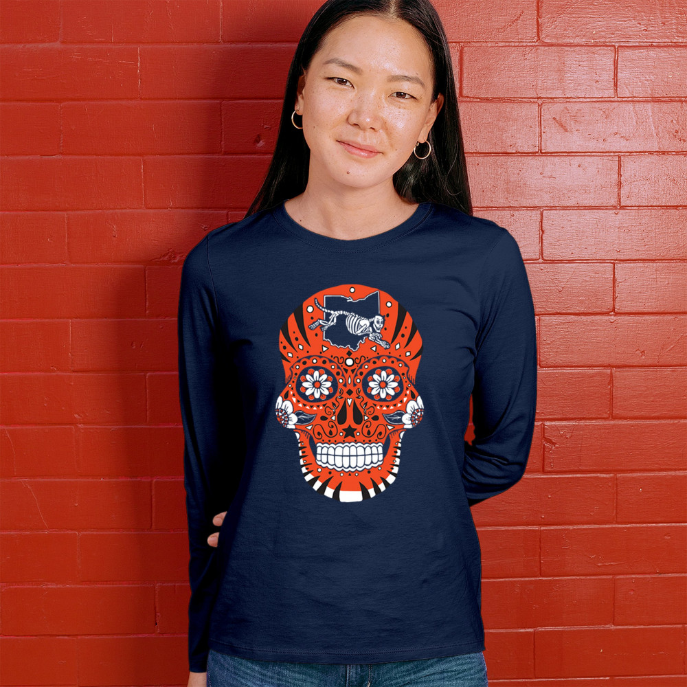 Cinci Sugar Skull with Queen City Paw, underdog grit, black & orange pride, Game Day energy, and playoff vibes.