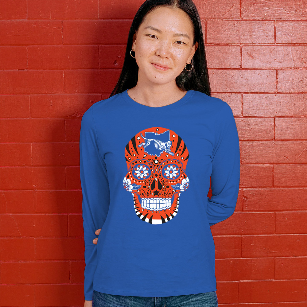 Cinci Sugar Skull with Queen City Paw, underdog grit, black & orange pride, Game Day energy, and playoff vibes.