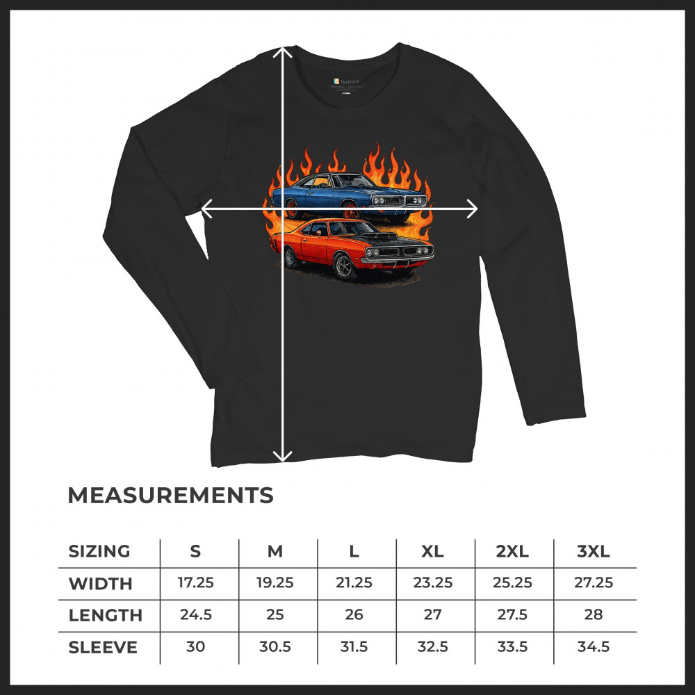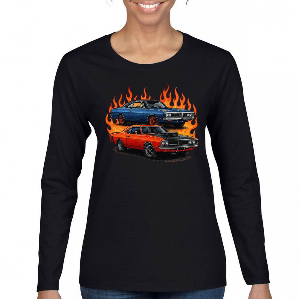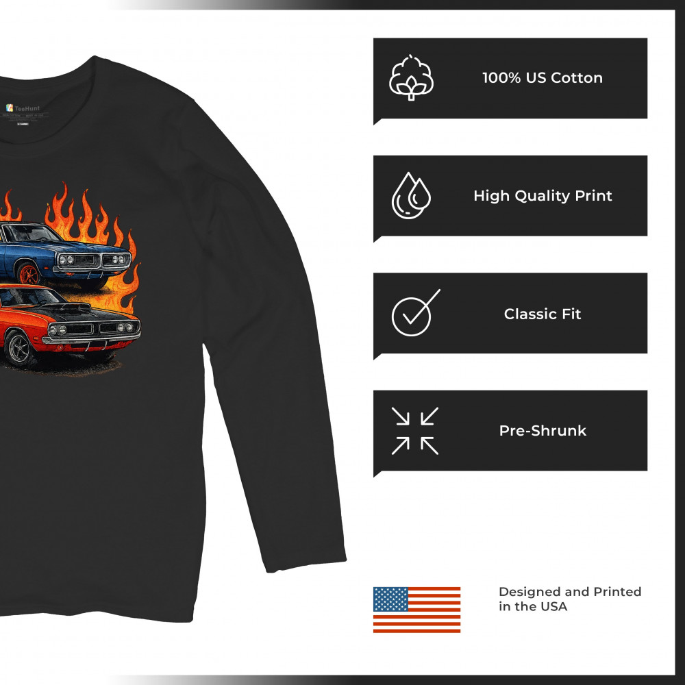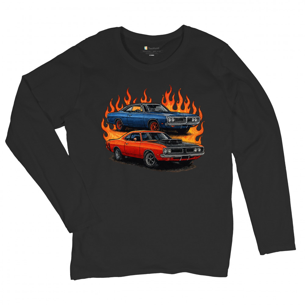 Bold flame design with classic muscle cars for gearheads and vintage horsepower lovers. Perfect for shows, cruise meets, and burnout nights.