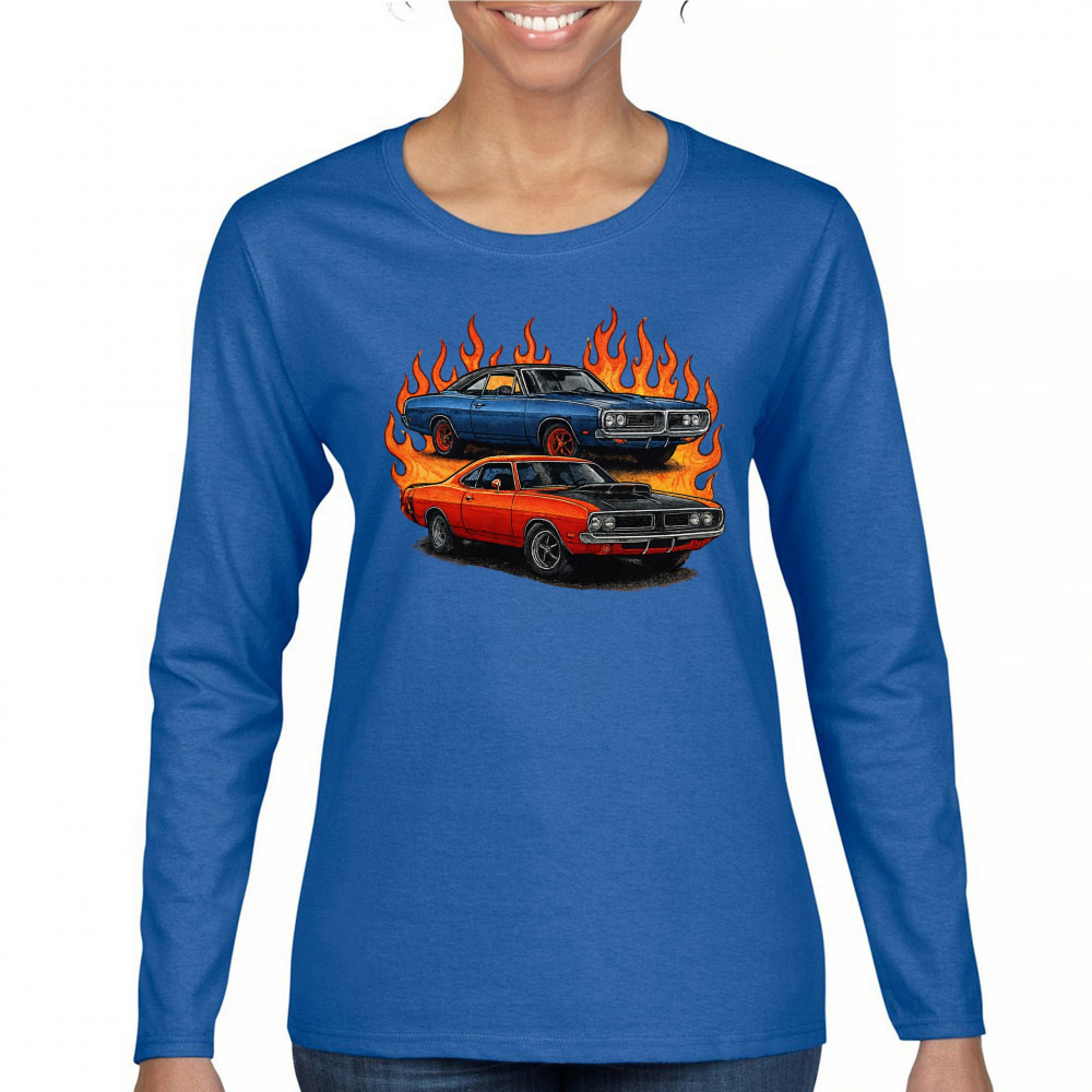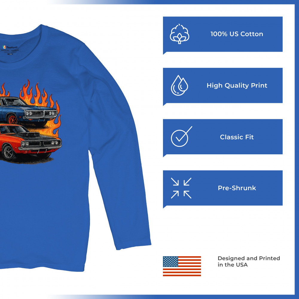 Bold flame design with classic muscle cars for gearheads and vintage horsepower lovers. Perfect for shows, cruise meets, and burnout nights.