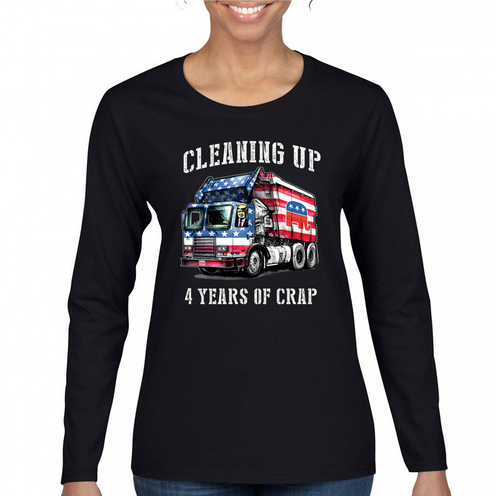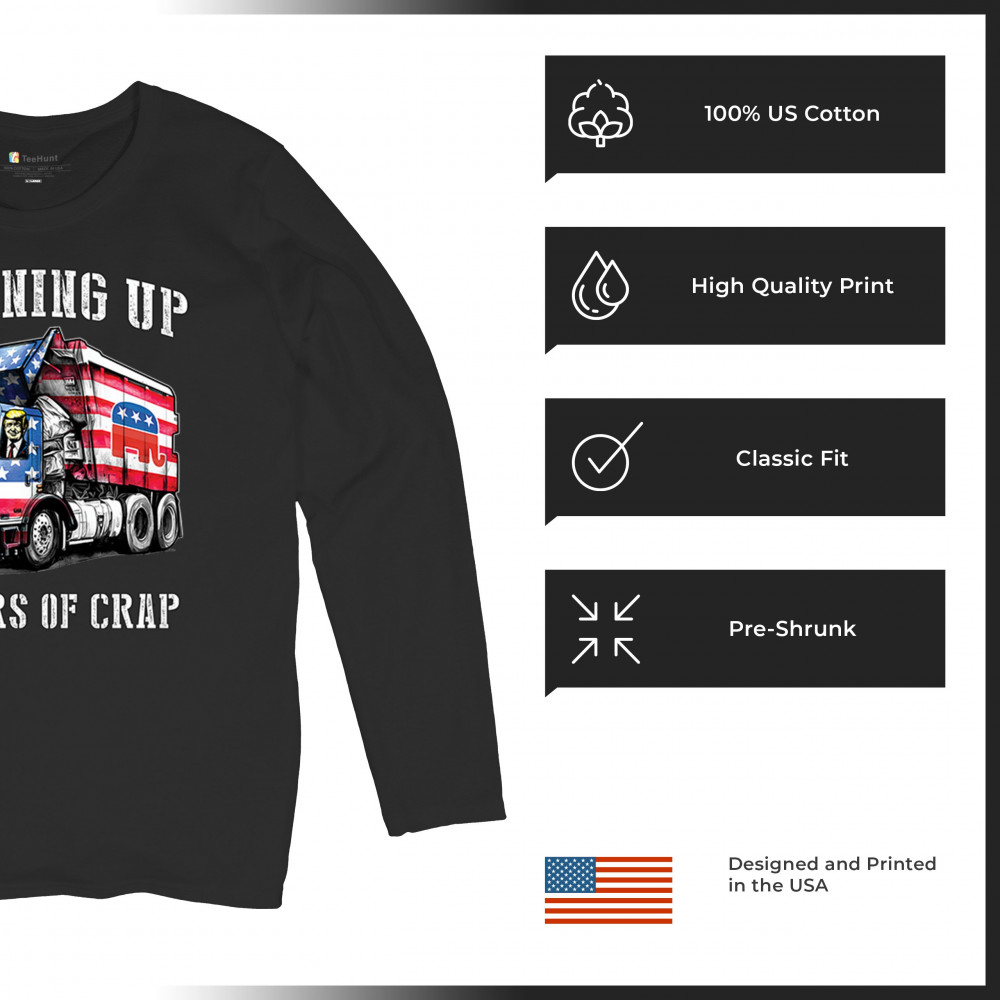 Bold "Cleaning Up 4 Years of Crap" design featuring Trump, the GOP, and the American flag. Perfect for proud conservatives and patriots.