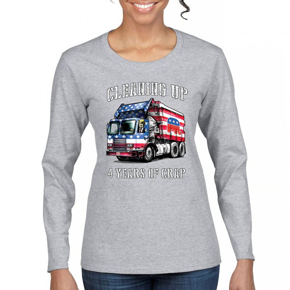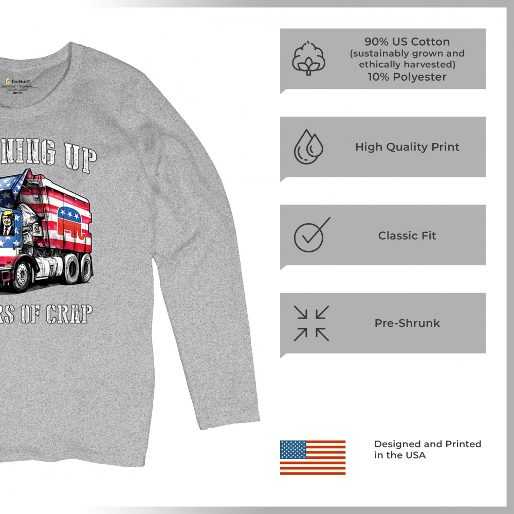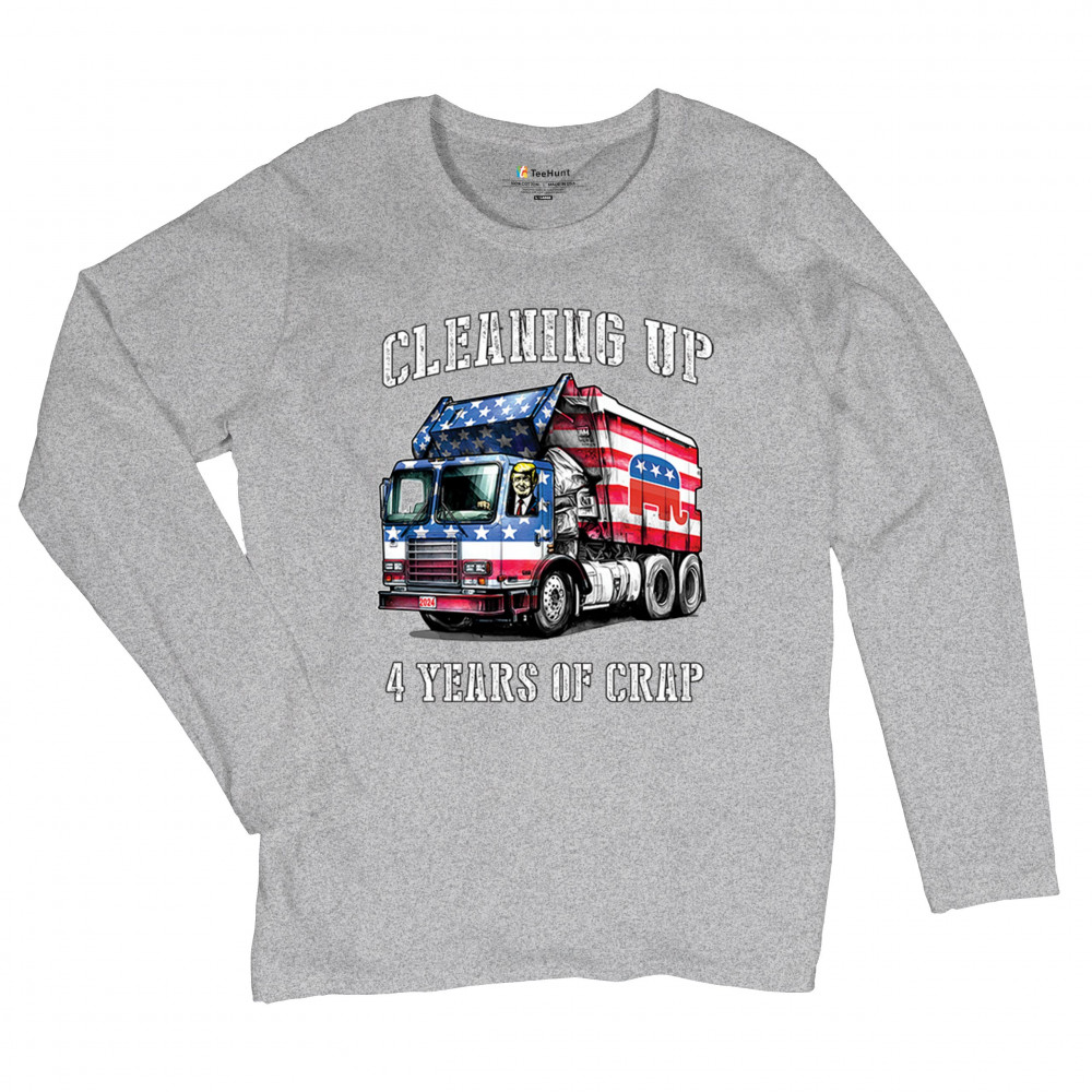 Bold "Cleaning Up 4 Years of Crap" design featuring Trump, the GOP, and the American flag. Perfect for proud conservatives and patriots.