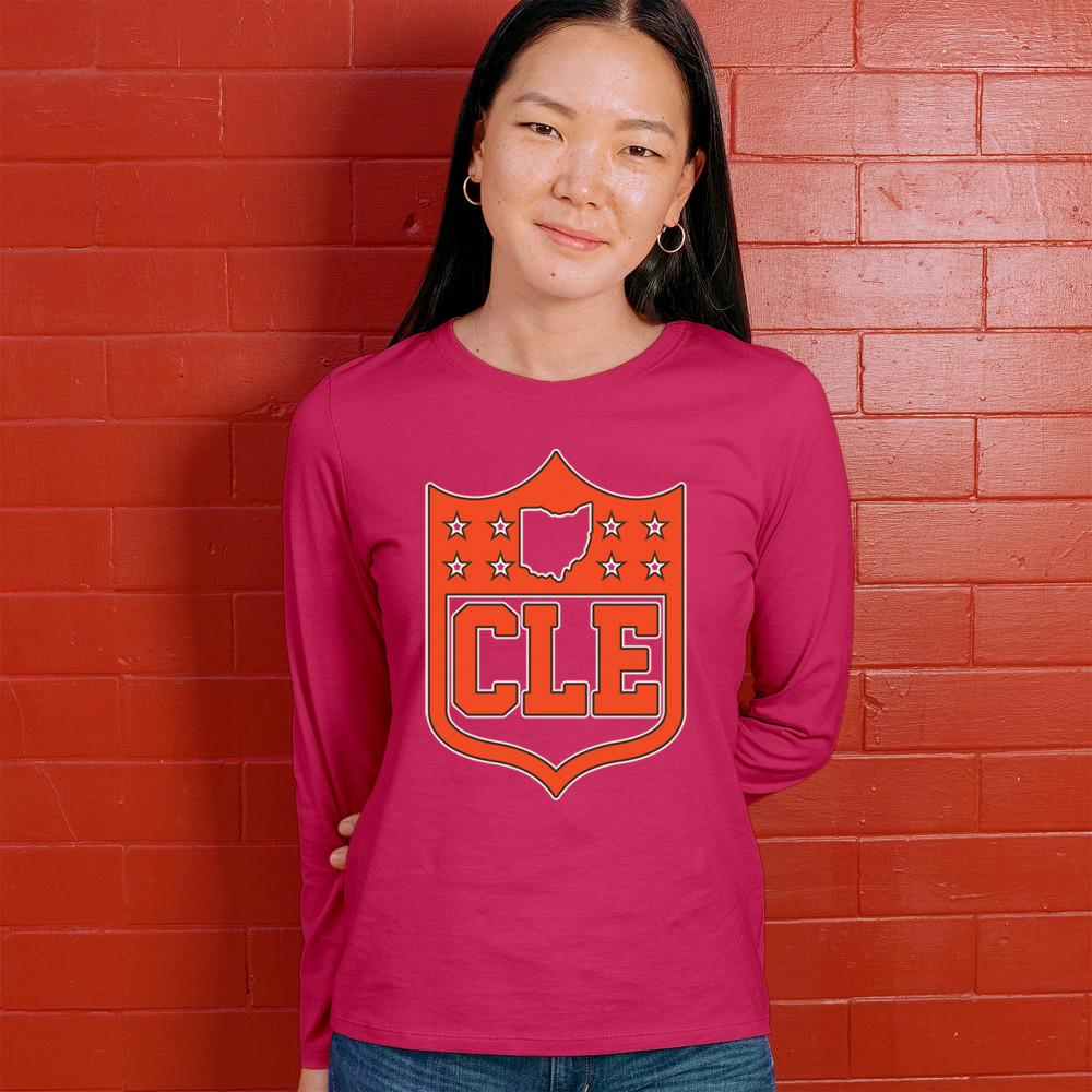 Bold CLE shield design honoring Cleveland football nation with Rust Belt pride, underdog grit, and blue collar sports heritage.