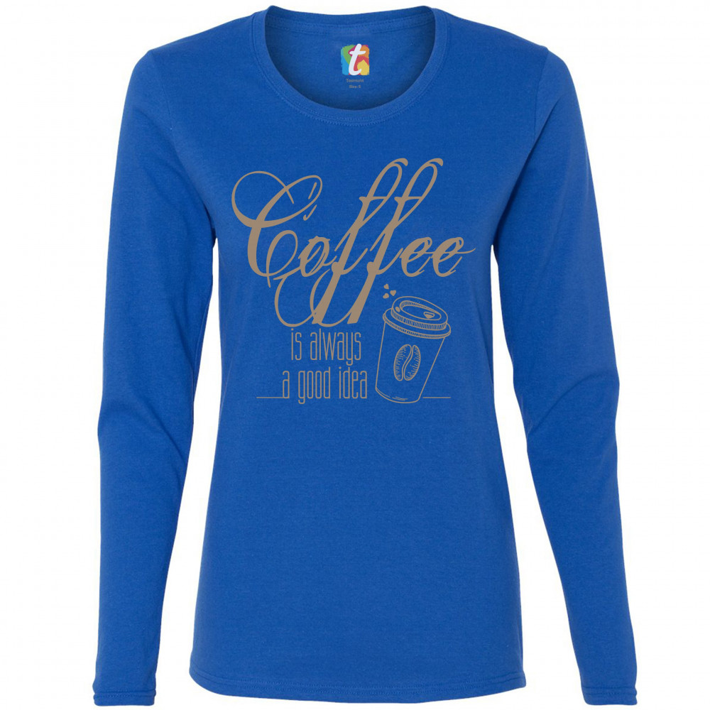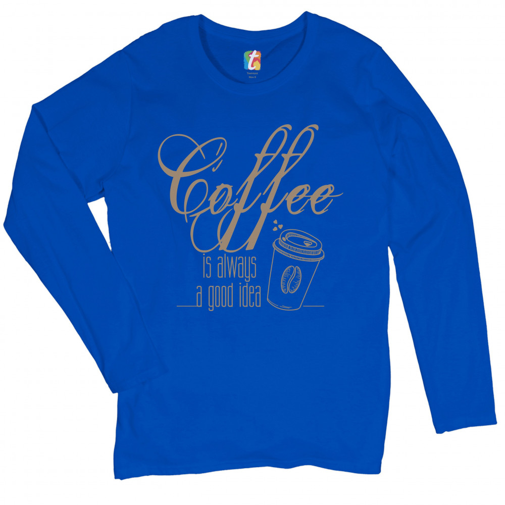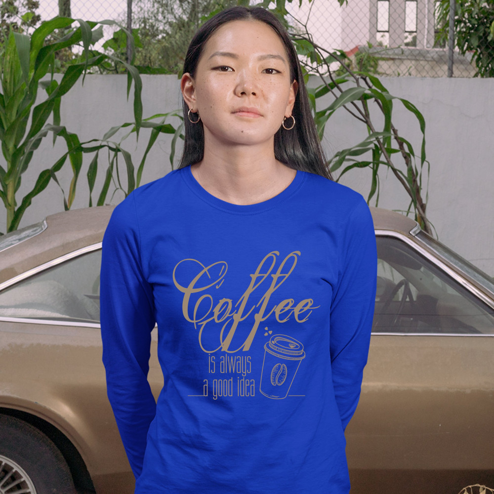 A print saying "Coffee is always a good idea". The print features a picture of a paper cup of tea with a coffee bean on it and with several hearts steaming from it. A great choice to wear to spread positive vibes and show what a passionate coffee fan you