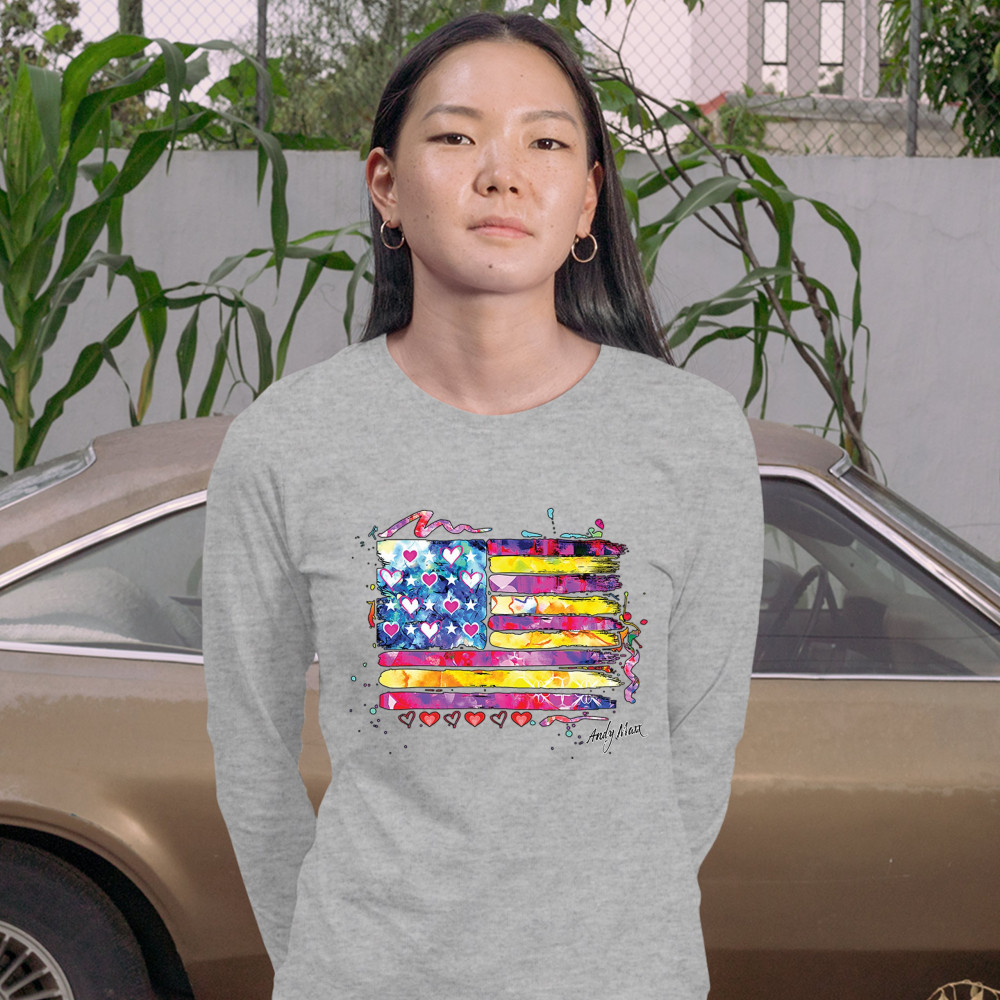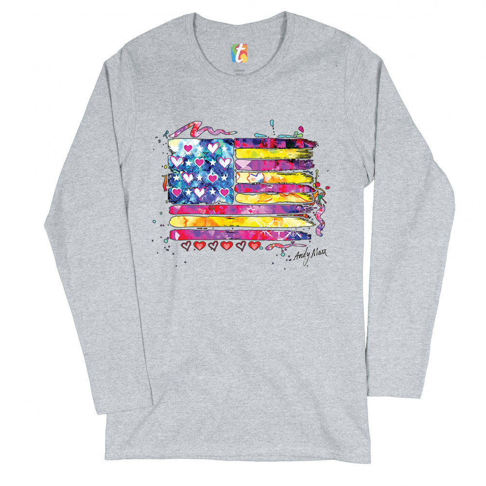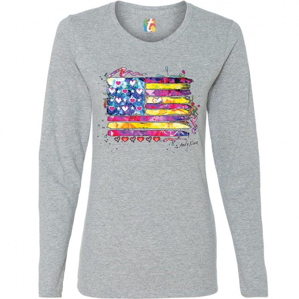 COLORFUL AMERICAN FLAG women's long sleeve t-shirt patriotic 4th of july usa gray