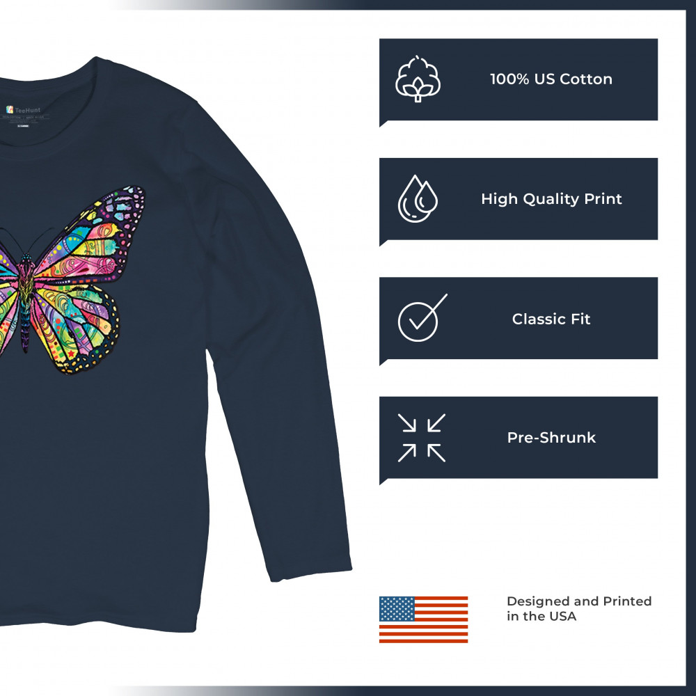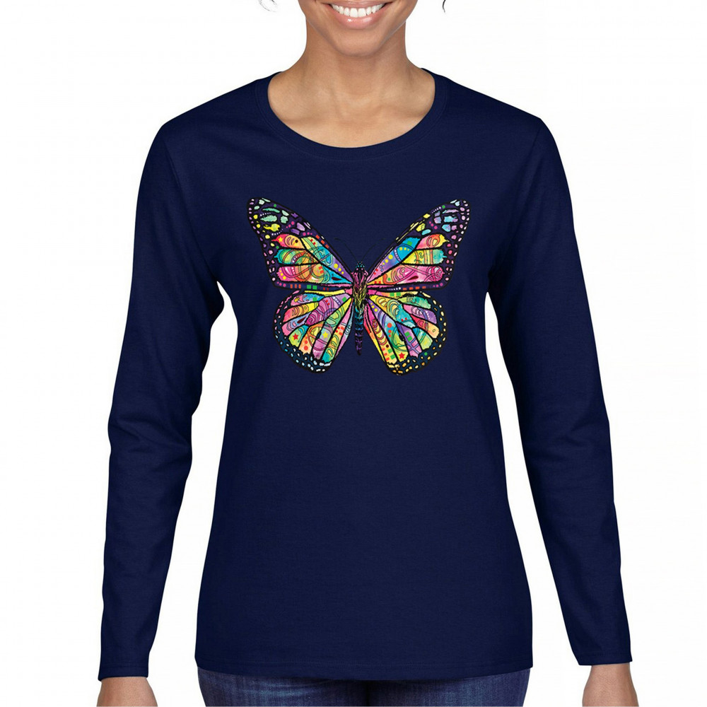 COLORFUL NEON BUTTERFLY women's long sleeve t-shirt dean russo beautiful nature navy blue