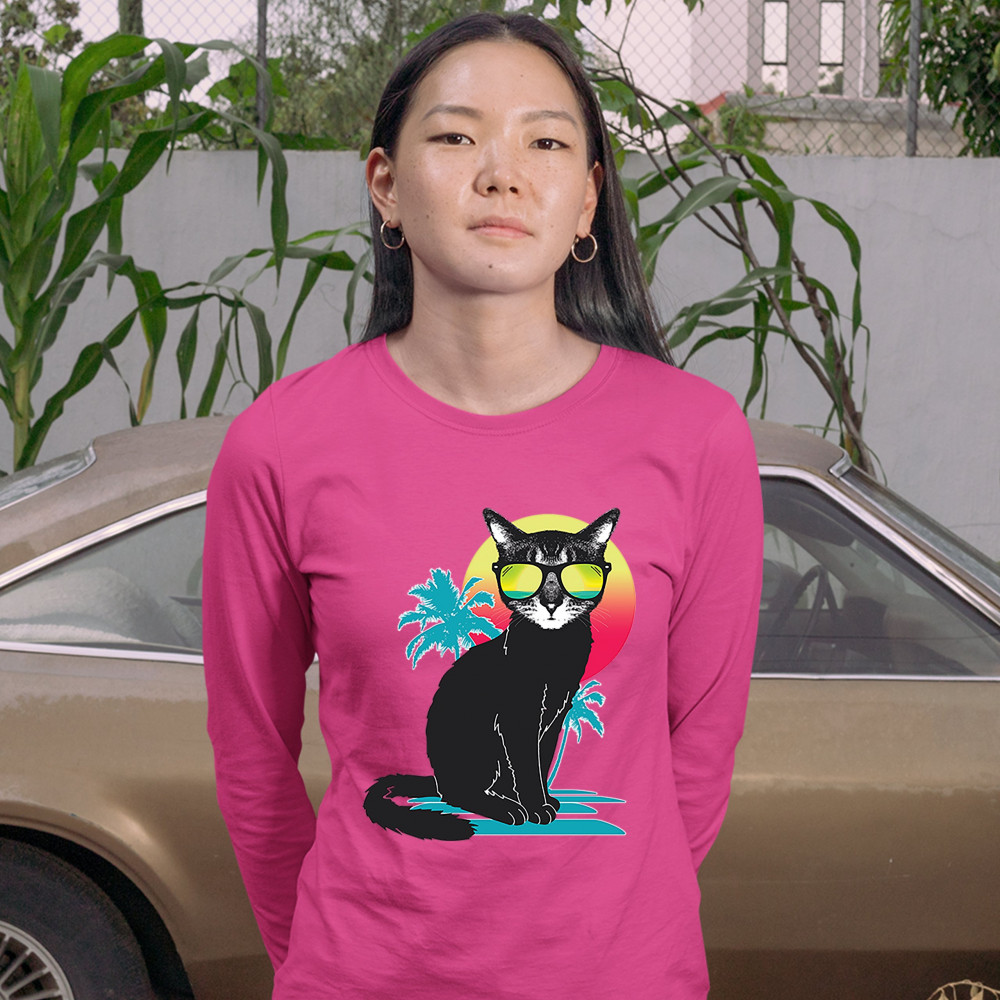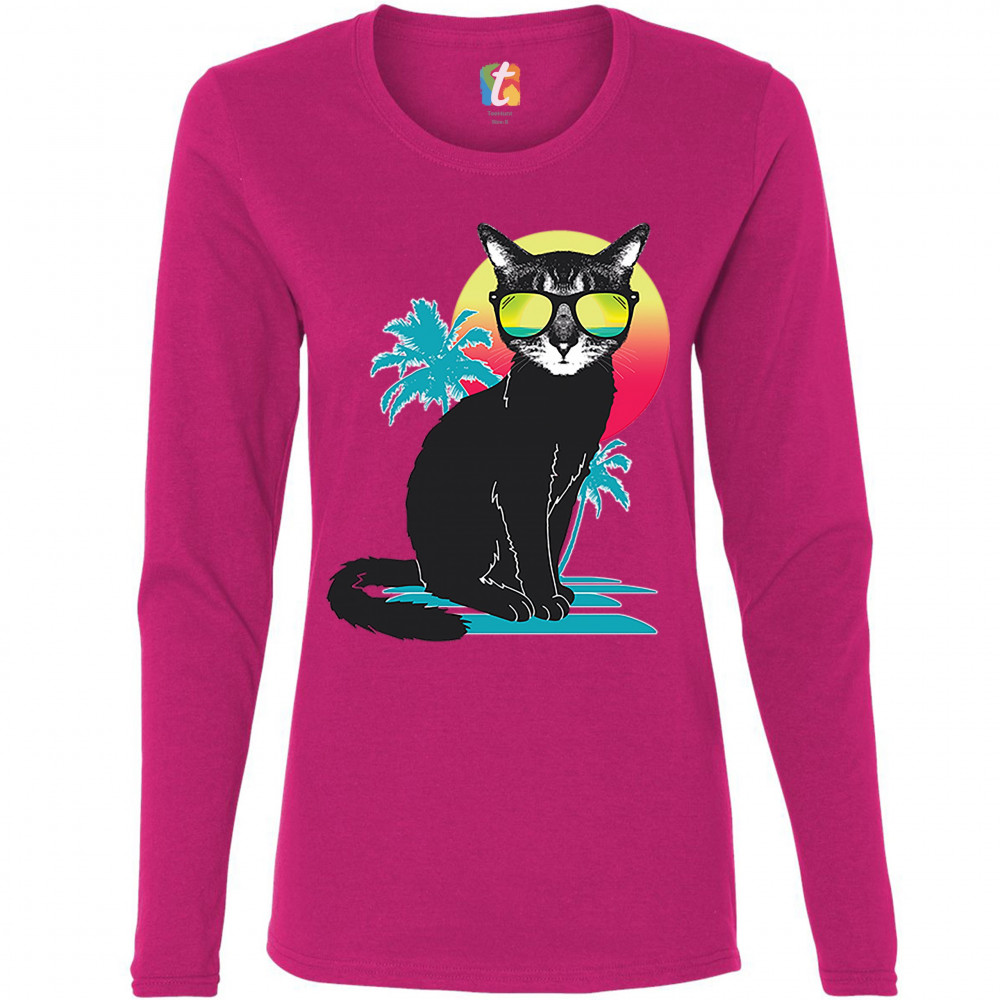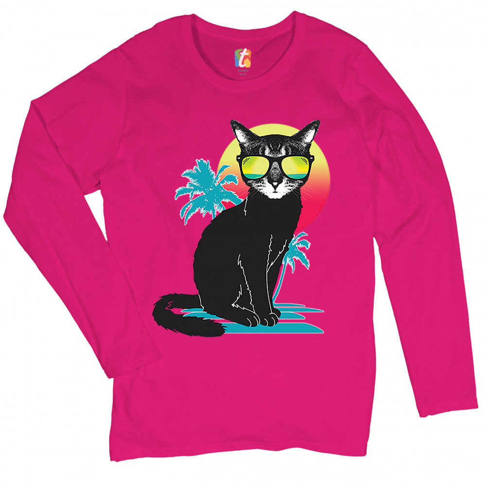 COOL SUMMER CAT women's long sleeve t-shirt neon kitty on a beach animal lovers pink