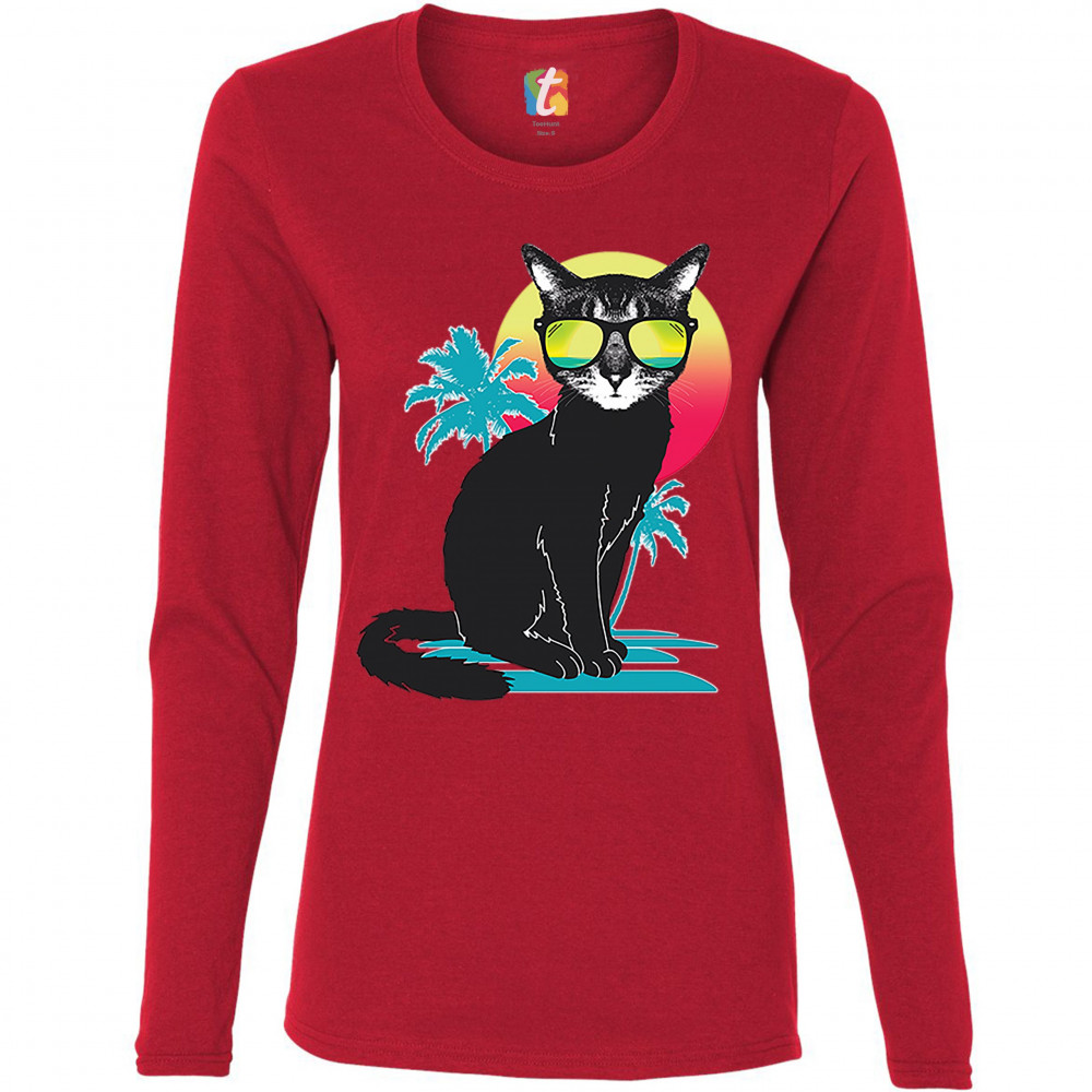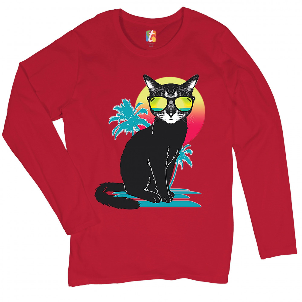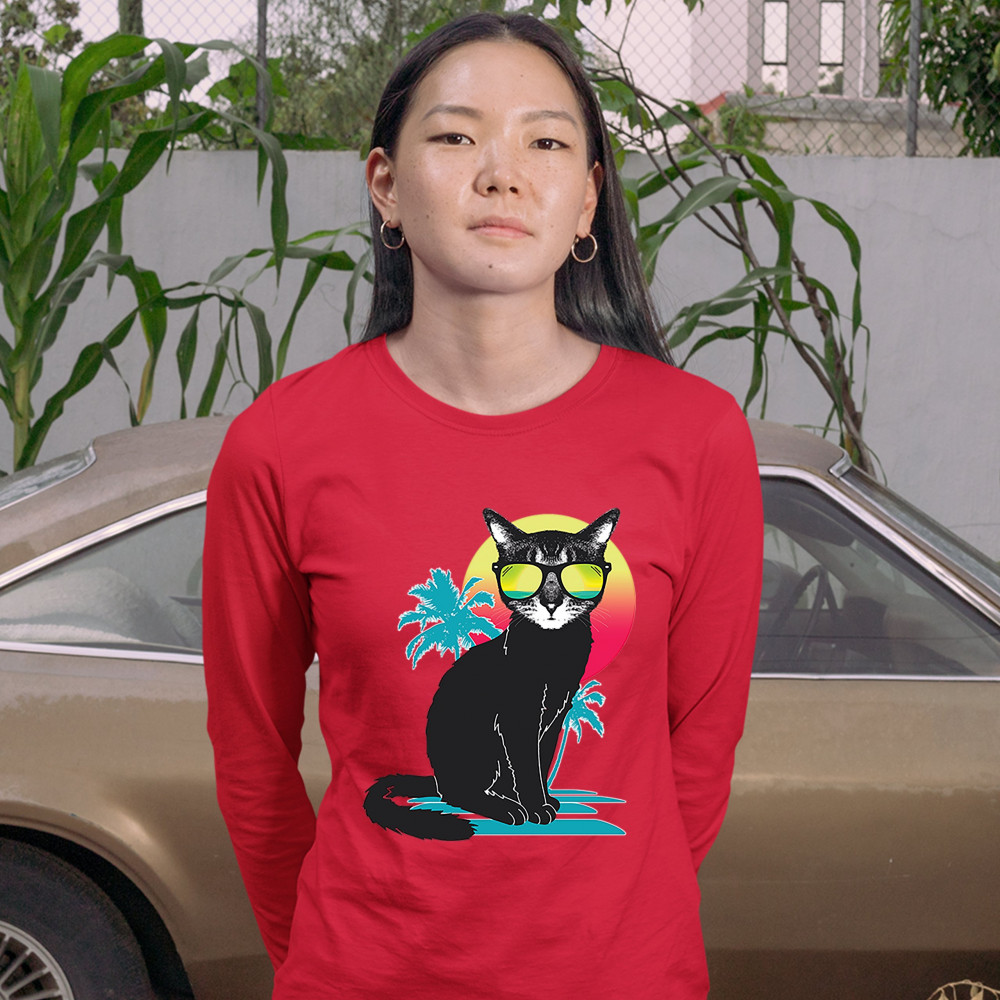 COOL SUMMER CAT women's long sleeve t-shirt neon kitty on a beach animal lovers red