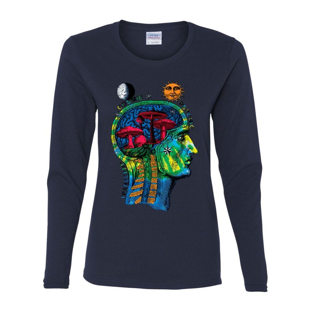 MUSHROOM HEAD cosmic psychic transcend women's long sleeve tee psychedelic trippy weird space navy blue