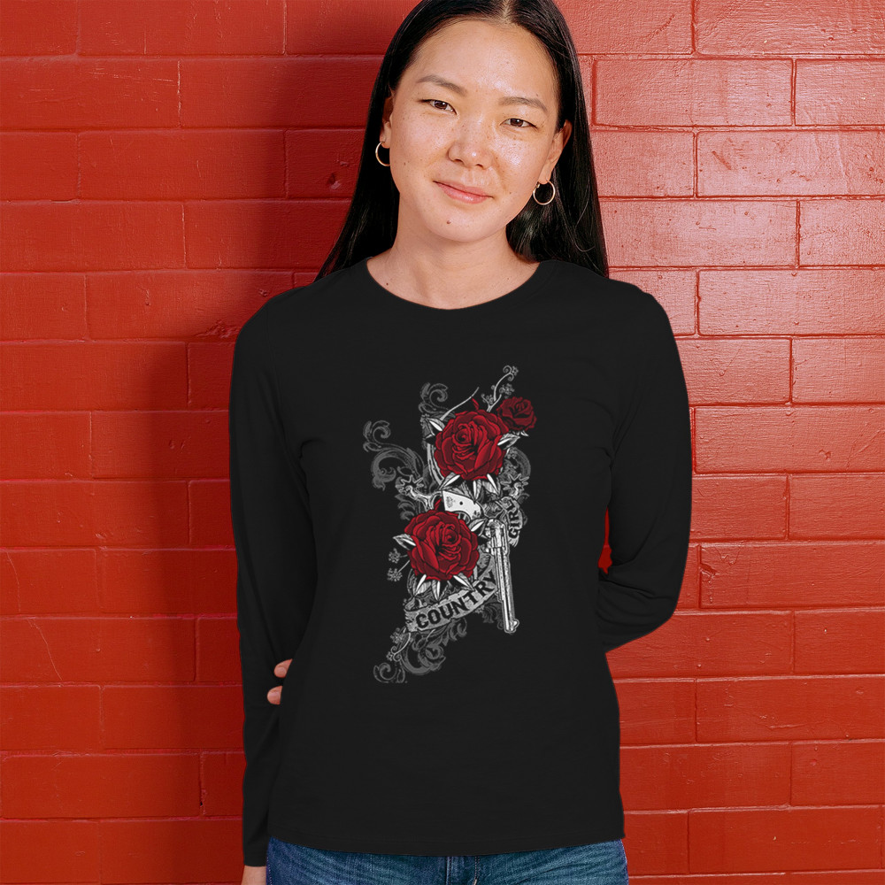 This western-inspired design features a silver revolver wrapped in deep red roses and scrolling filigree. A perfect balance of bold and beautiful, it’s ideal for country girls who ride strong, dress proud, and love a design that speaks to both grit and grace. Great for nights out, fairs, and rodeo weekends.