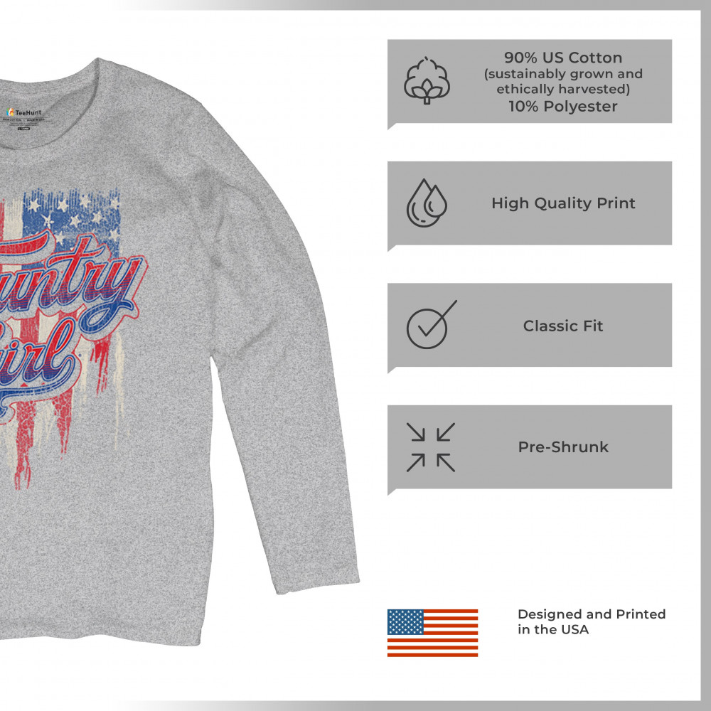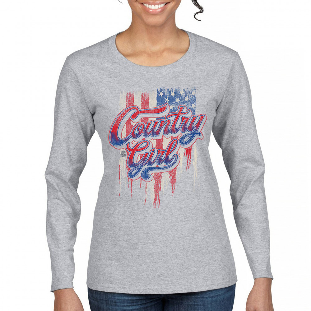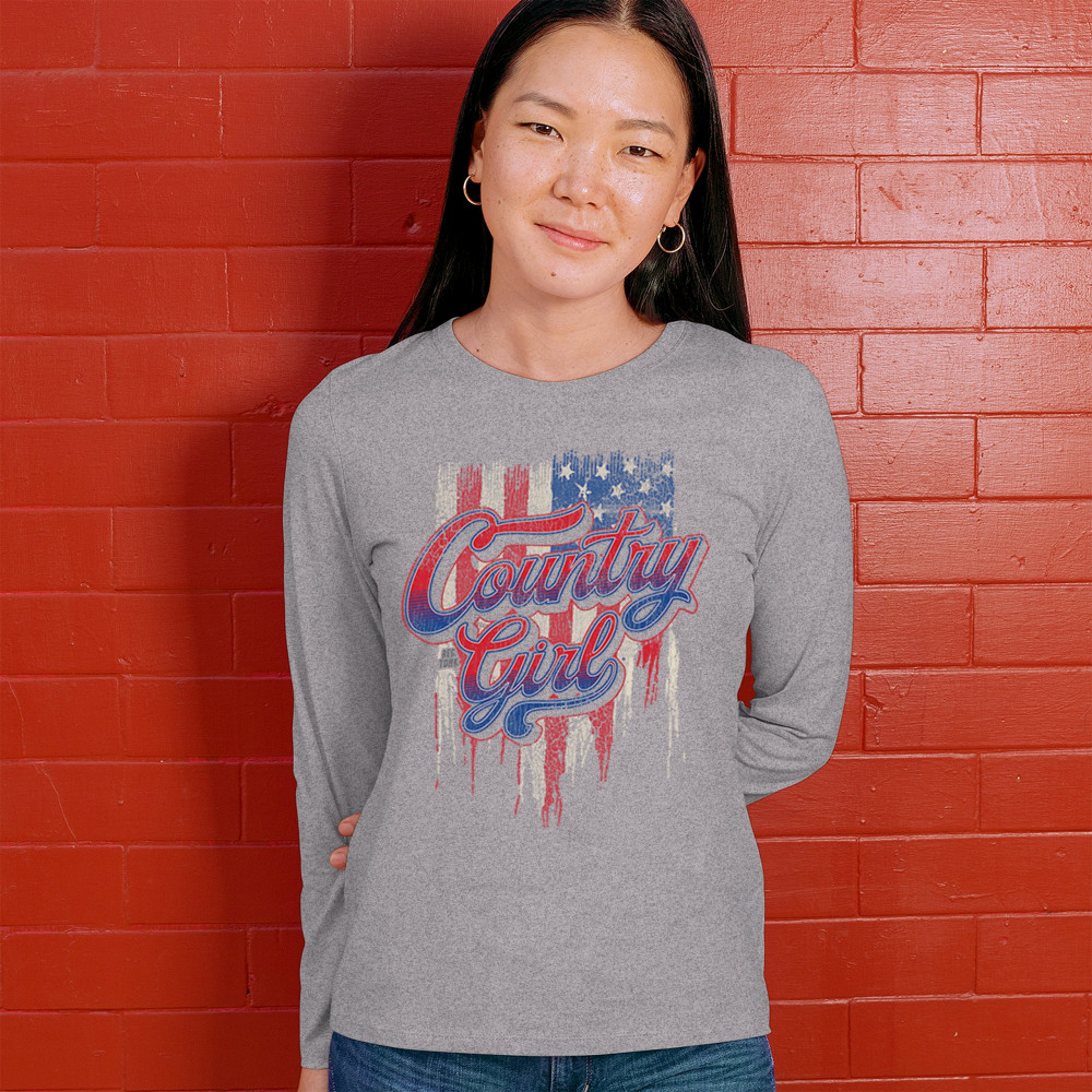 Patriotic country girl design with flag backdrop and bold script—perfect for rodeos, BBQs, ranch life, or 4th of July pride.