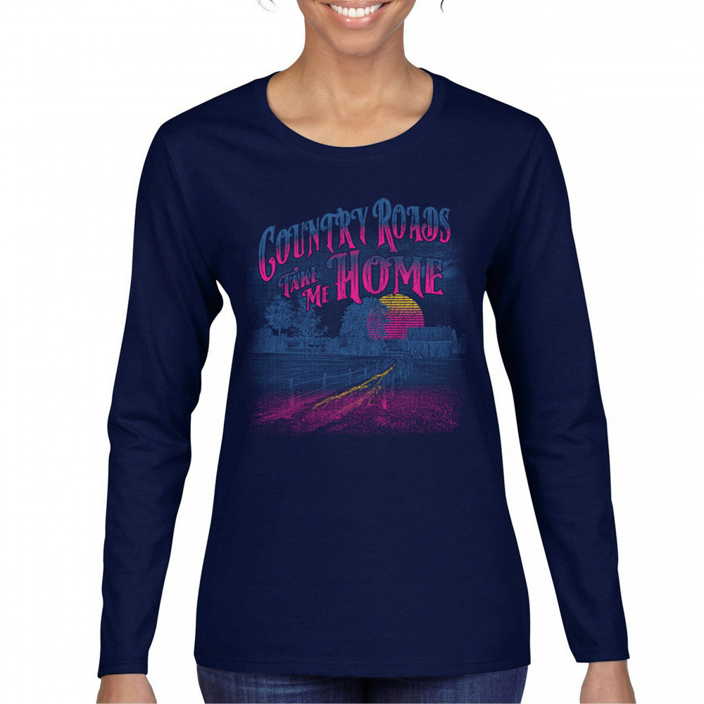 Retro sunset "Country Roads Take Me Home" design for road trip lovers, Americana fans, and country music souls. Bright, bold, and nostalgic.