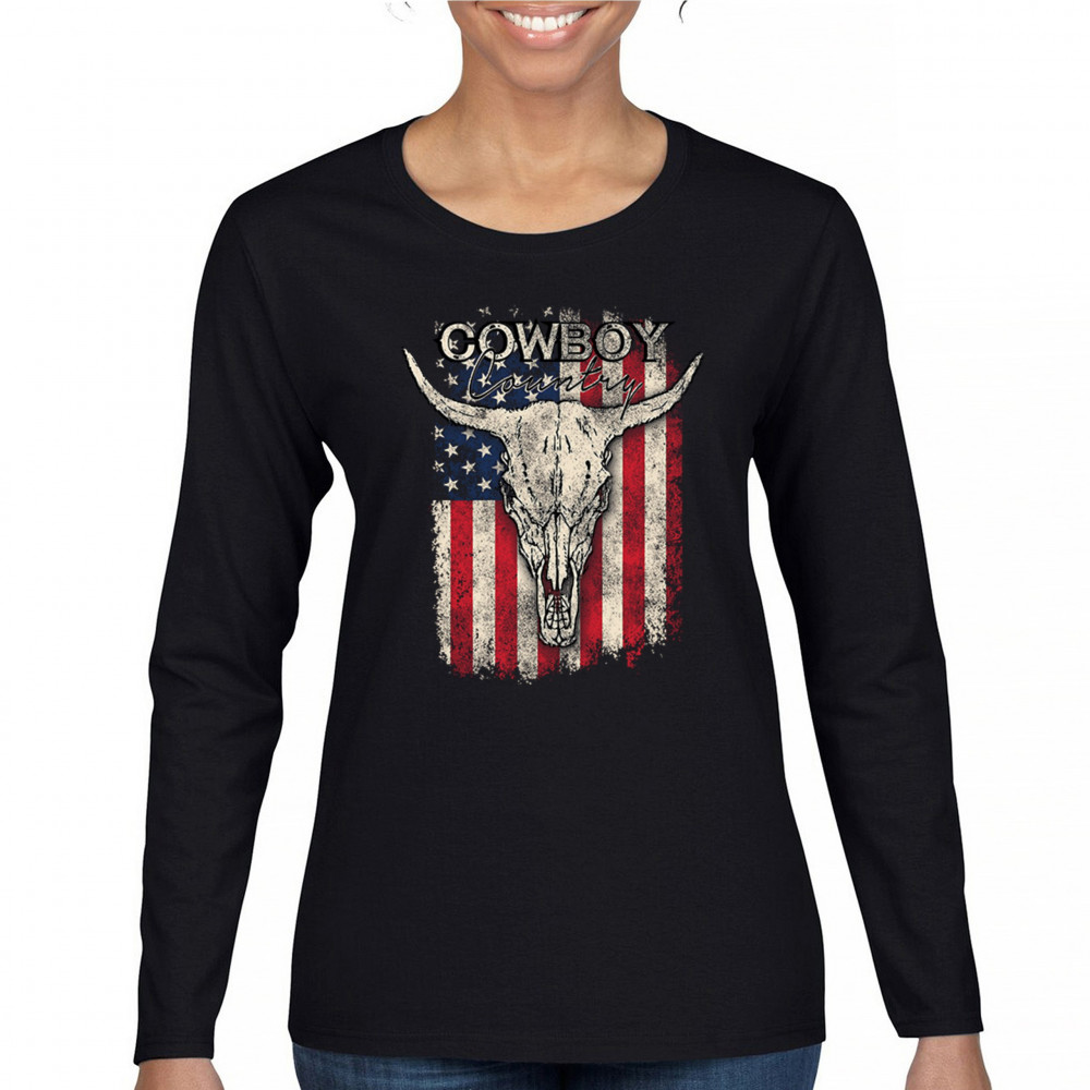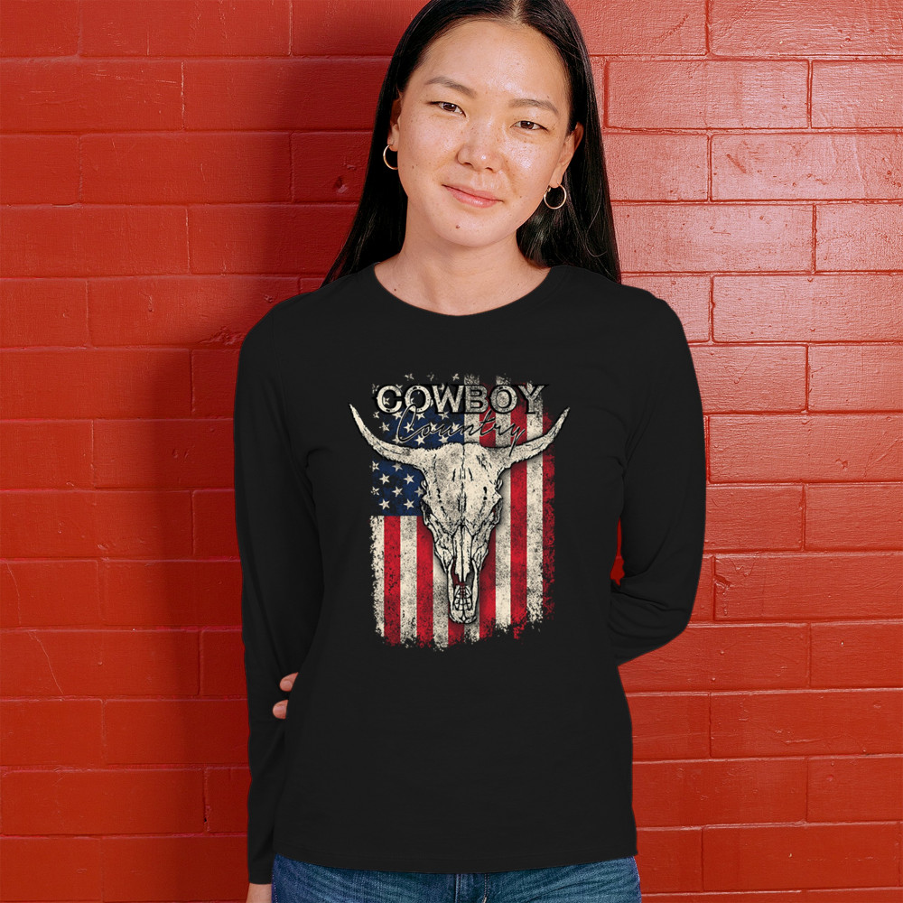 Cowboy Country steer skull design fuses rustic Americana, rodeo style, western heritage, and desert vibes for true frontier spirit.