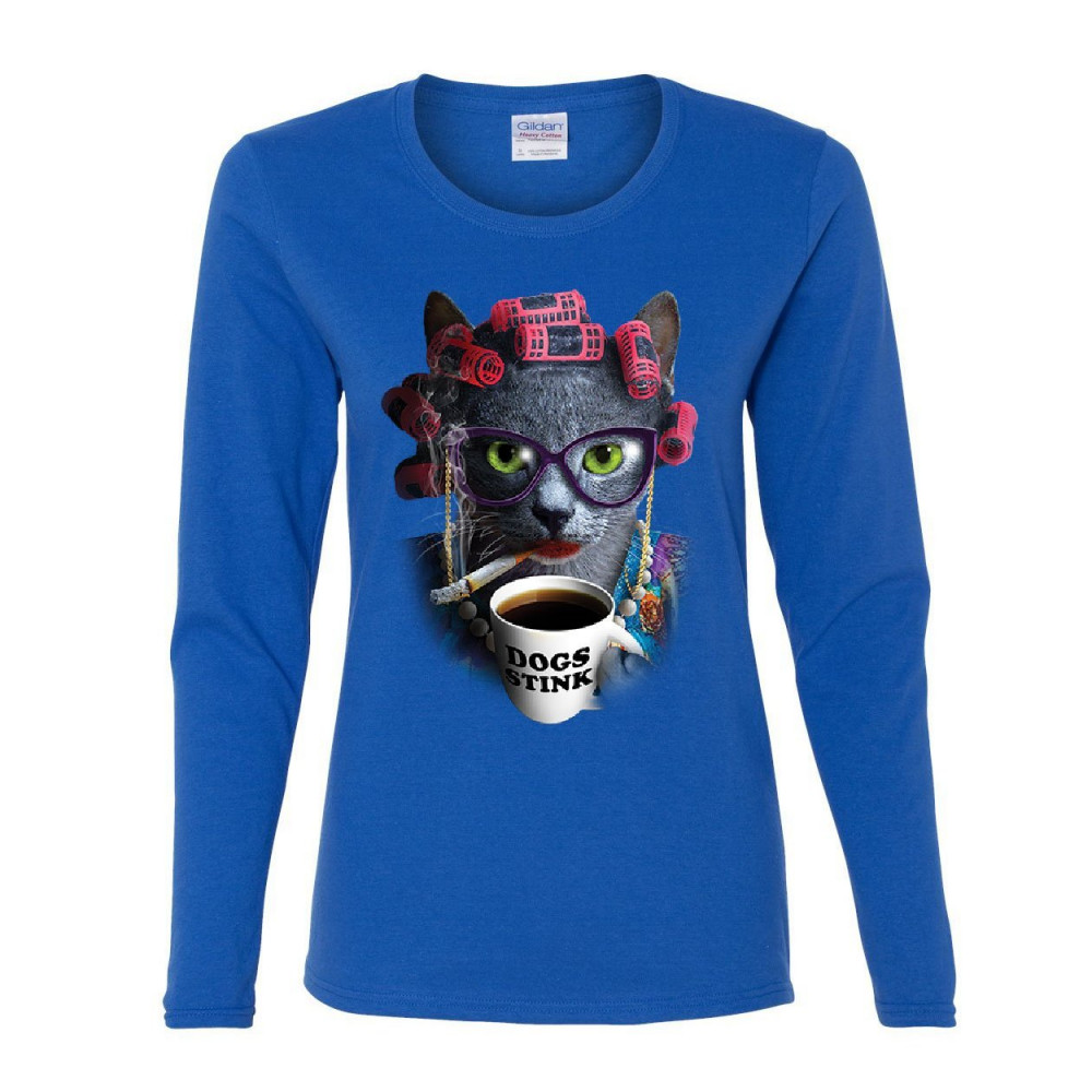 CRAZY OLD CAT LADY women's long sleeve tee dogs stink funny kitten cat lover pet royal blue