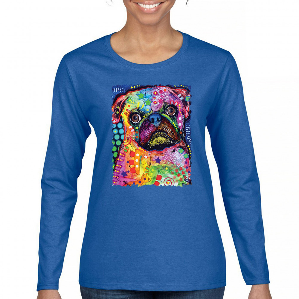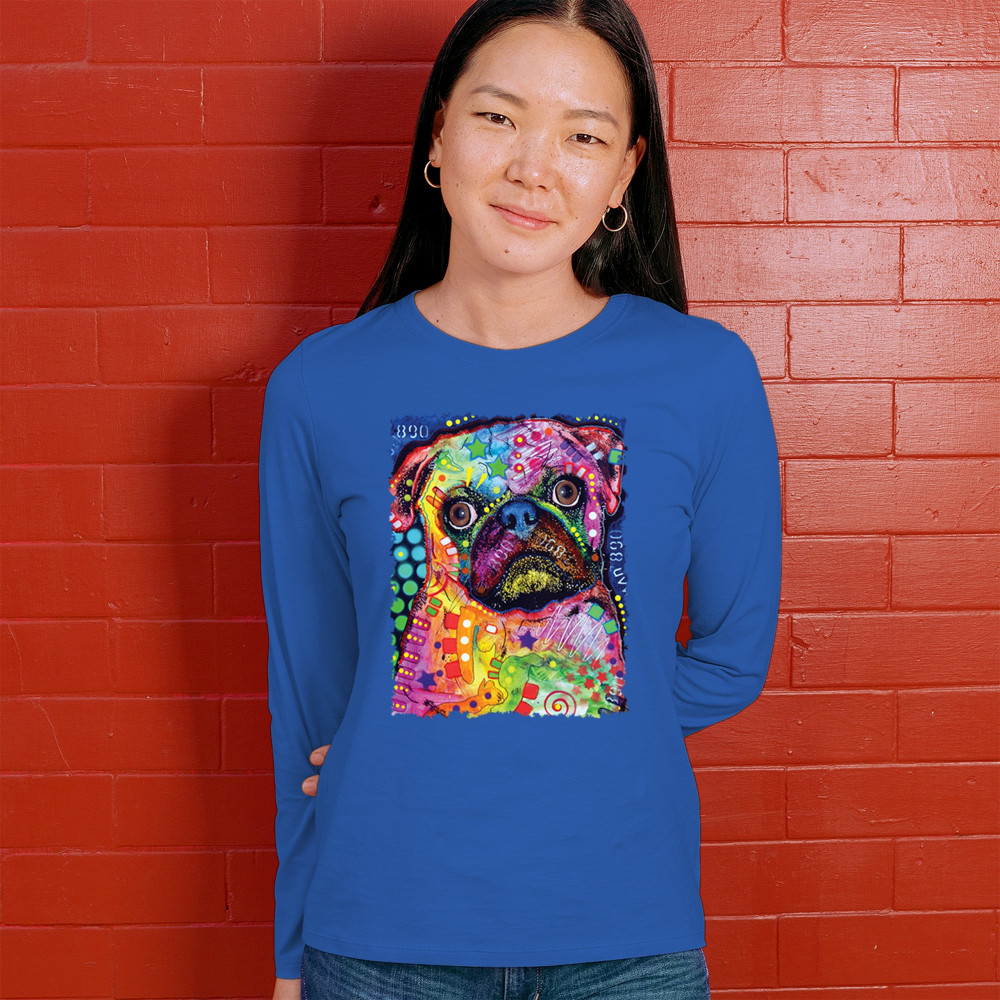 CUTE PUG PUPPY women's long sleeve t-shirt dean russo colorful neon mosaic dog royal blue