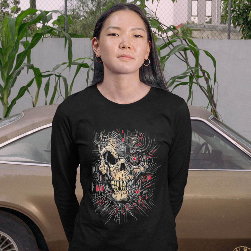 CYBORG SKULL FACE women's long sleeve t-shirt scary cyberpunk robot horror black