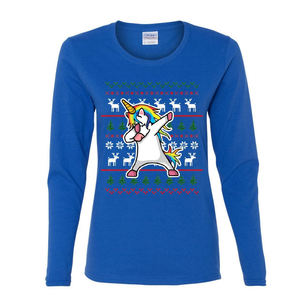DABBING UNICORN ugly sweater women's long sleeve tee christmas xmas dab rudolph royal blue