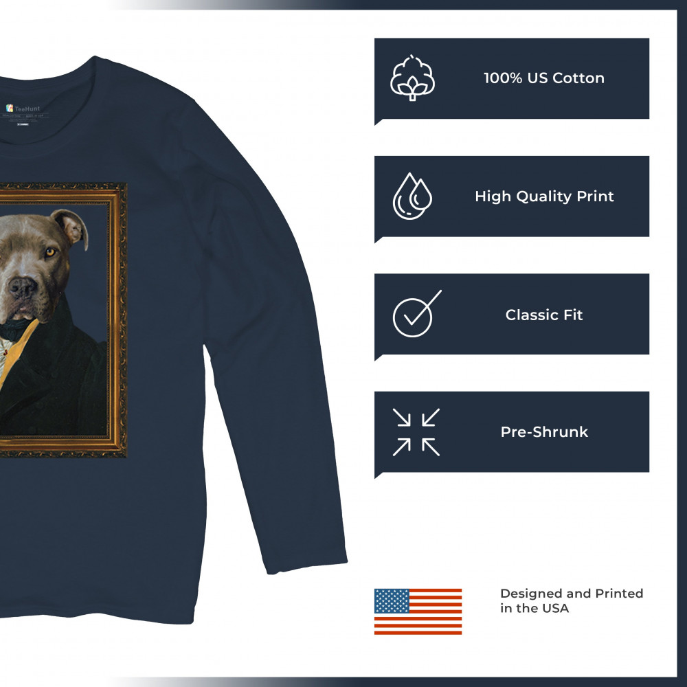 Unique pit bull portrait in 18th-century attire, blending humor and elegance for pet lovers and history enthusiasts. Perfect for home or office decor.