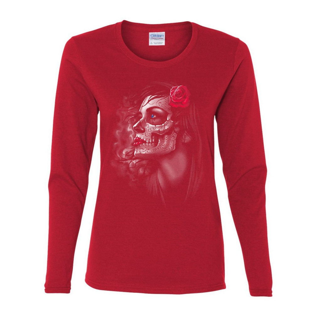 DAY OF THE DEAD GIRL women's long sleeve tee skull face dia de los muertos roses red