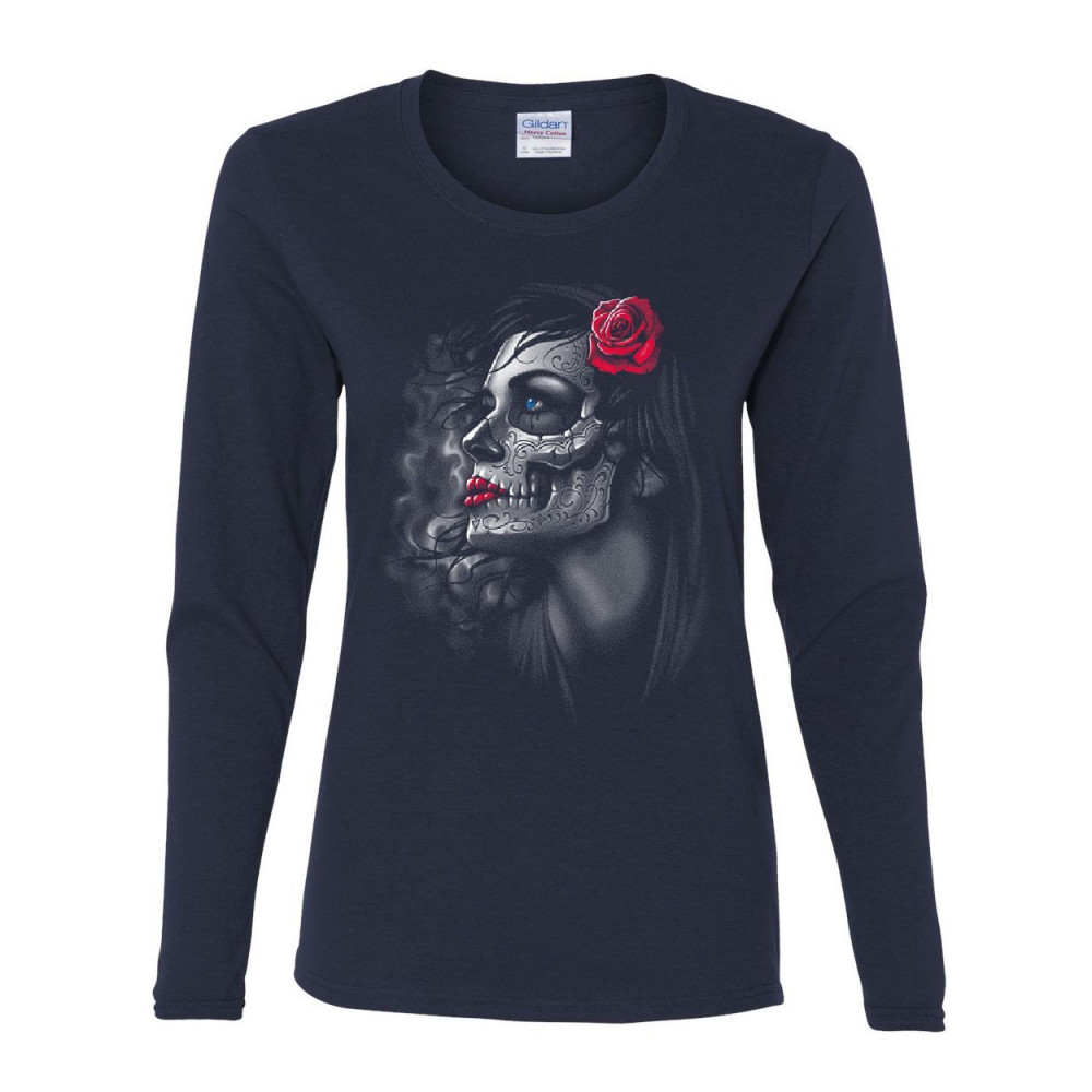DAY OF THE DEAD GIRL women's long sleeve tee skull face dia de los muertos roses navy blue