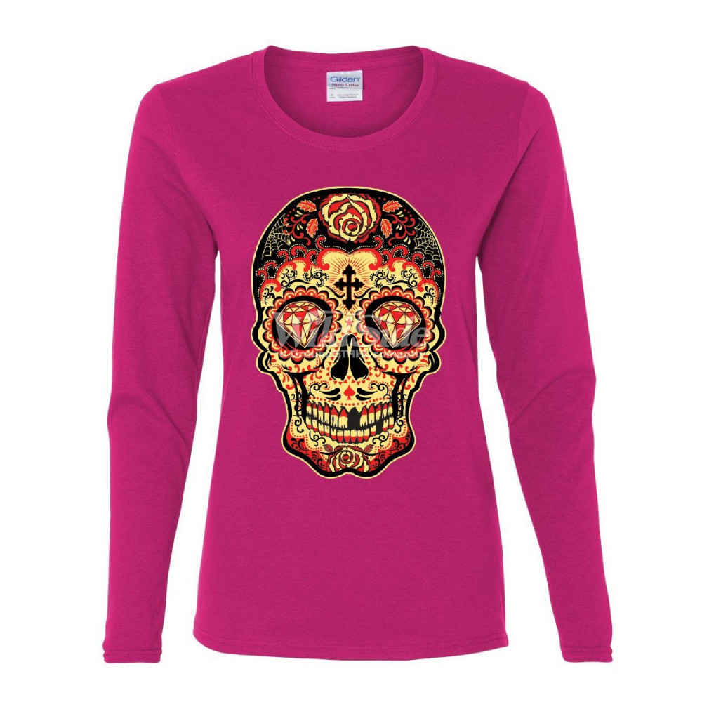 DAY OF THE DEAD SUGAR SKULL women's long sleeve tee gold calavera dia de muertos pink