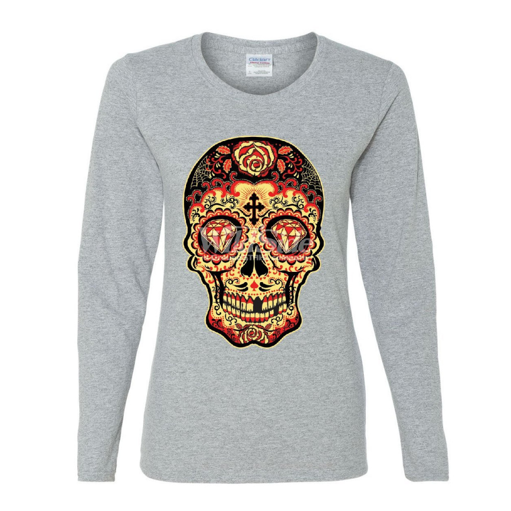 DAY OF THE DEAD SUGAR SKULL women's long sleeve tee gold calavera dia de muertos gray
