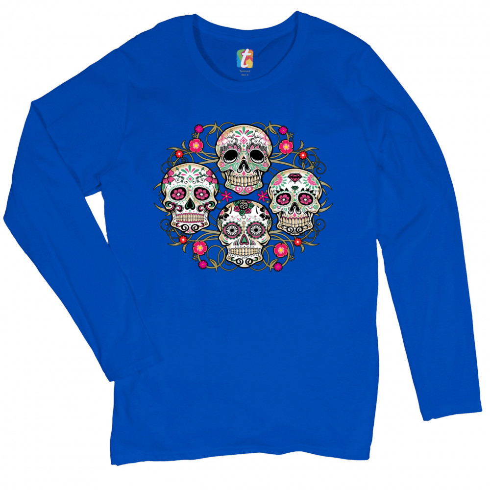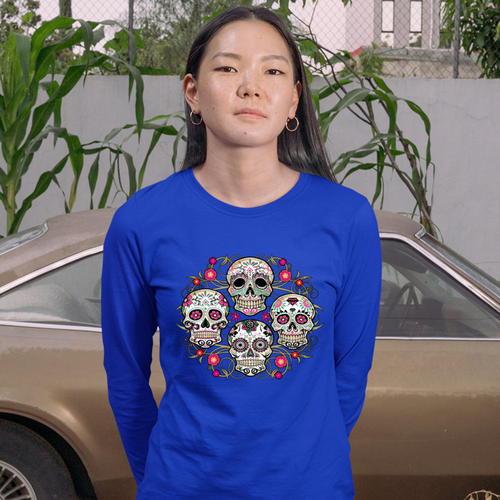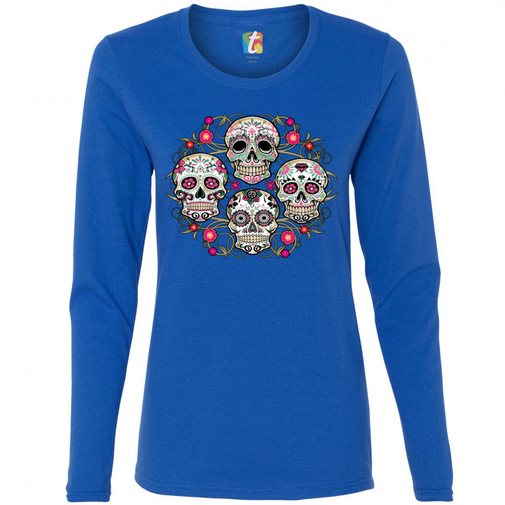 DAY OF THE DEAD FLORAL SUGAR SKULLS day of the dead sugar skulls women's long sleeve t-shirt dia de los muertos royal blue