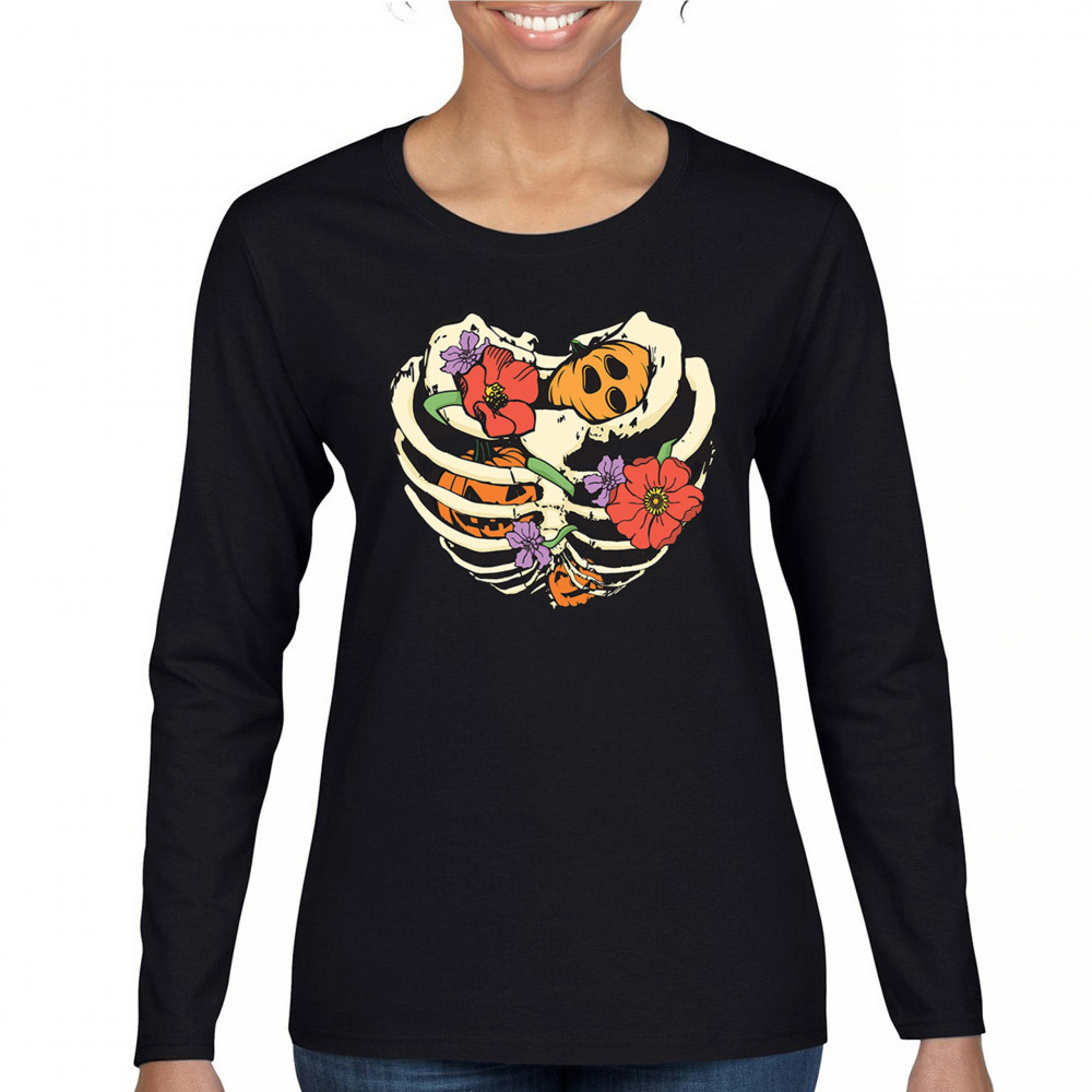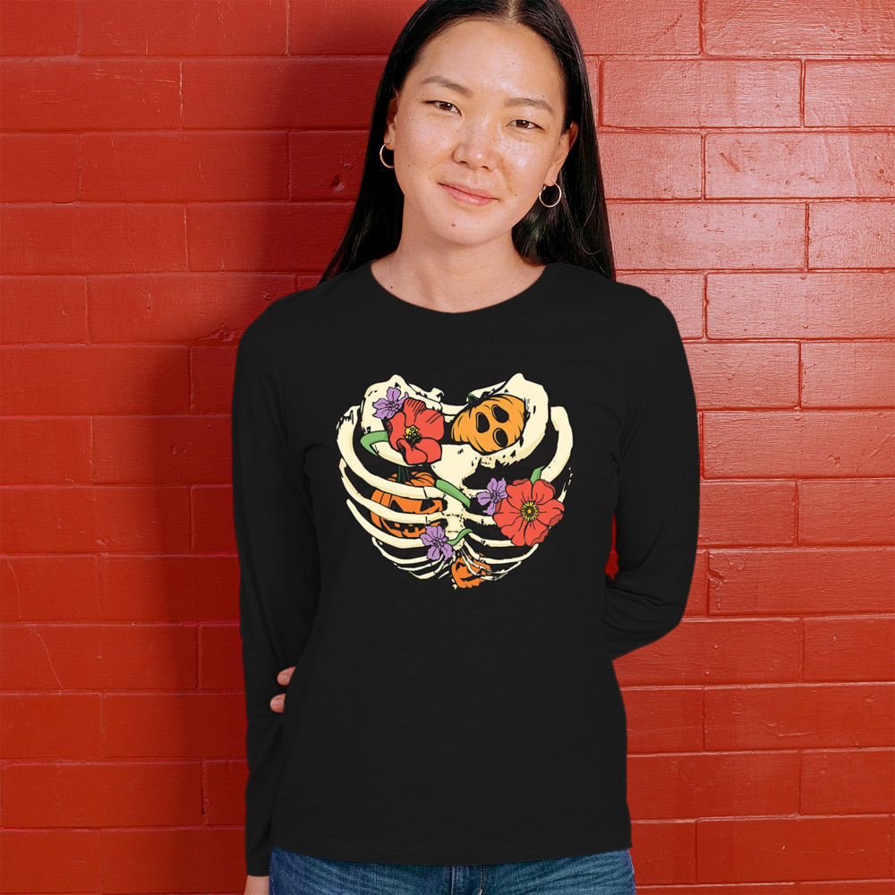 Celebrate Halloween with a quirky and cute design featuring a skeleton ribcage filled with pumpkins and flowers. Perfect for spooky season lovers!