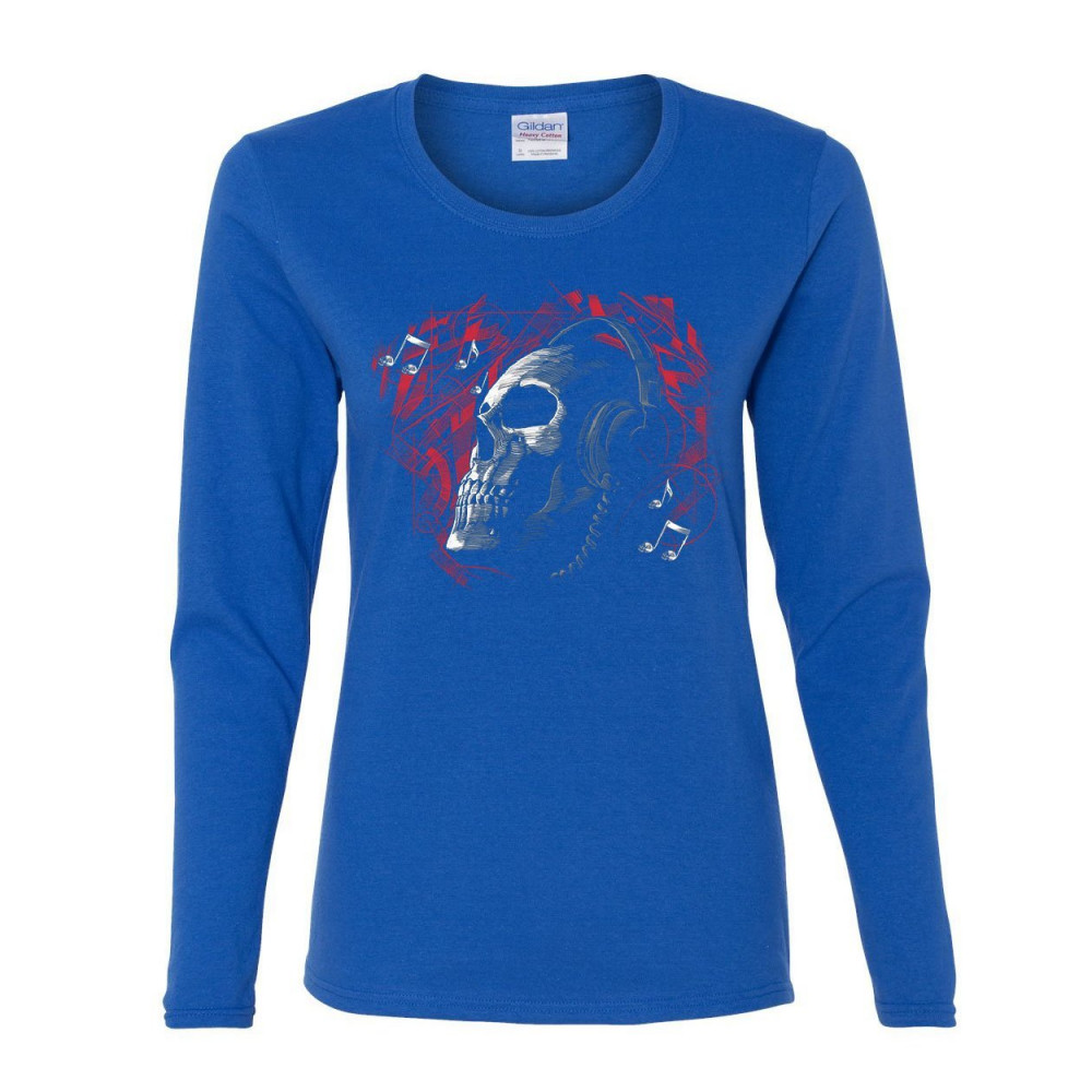 DEADPHONES women's long sleeve tee music headphones skull face dead edm hip hop royal blue