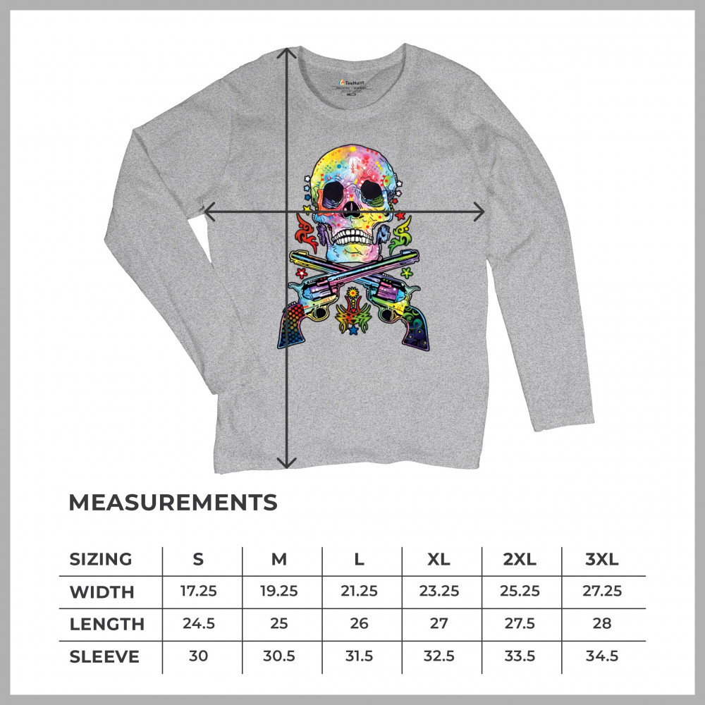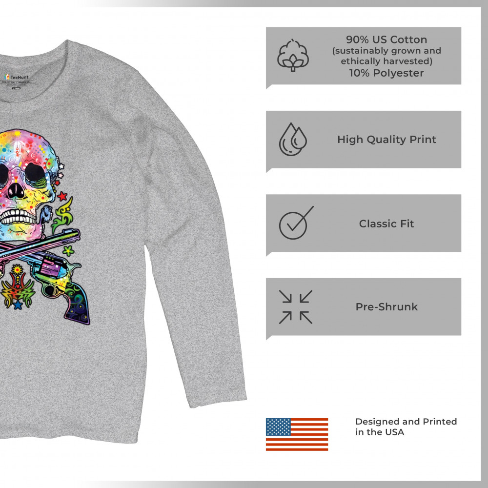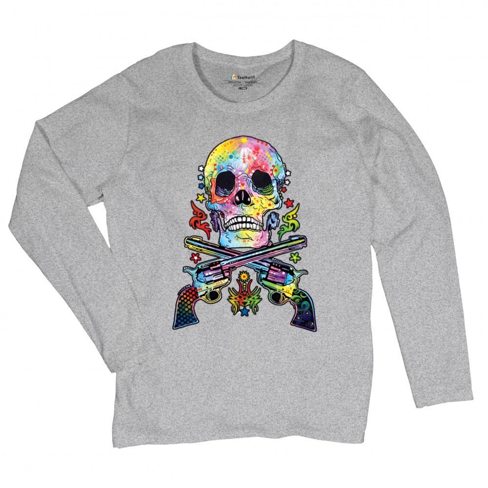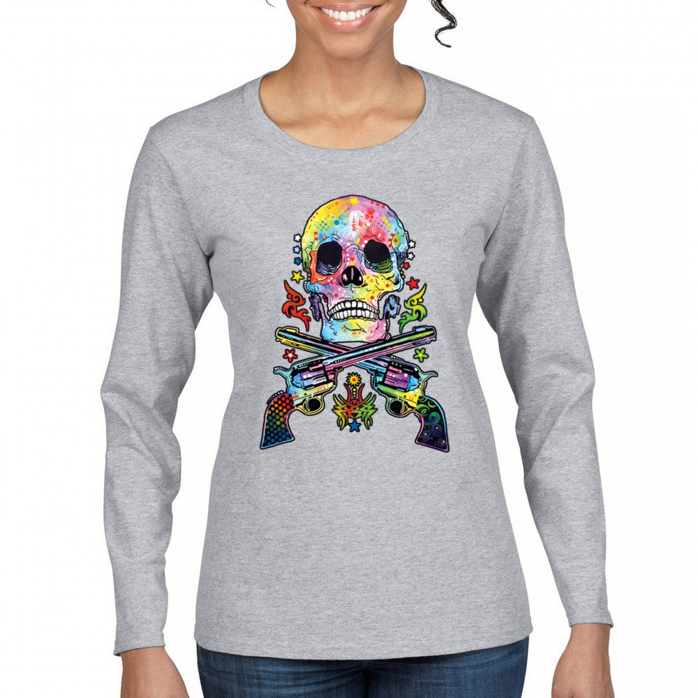 DEAN RUSSO ART SKULL AND GUNS women's long sleeve t-shirt colorful 2nd amendment gray