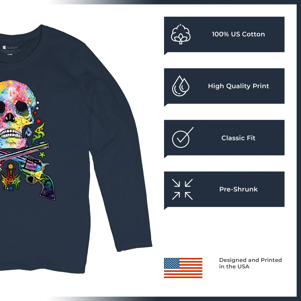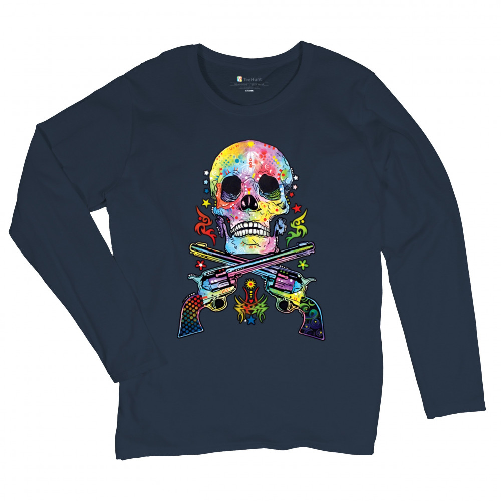 DEAN RUSSO ART SKULL AND GUNS women's long sleeve t-shirt colorful 2nd amendment navy blue