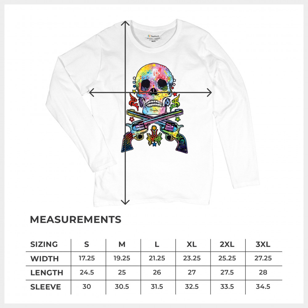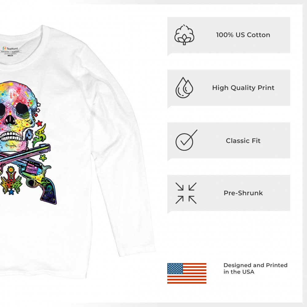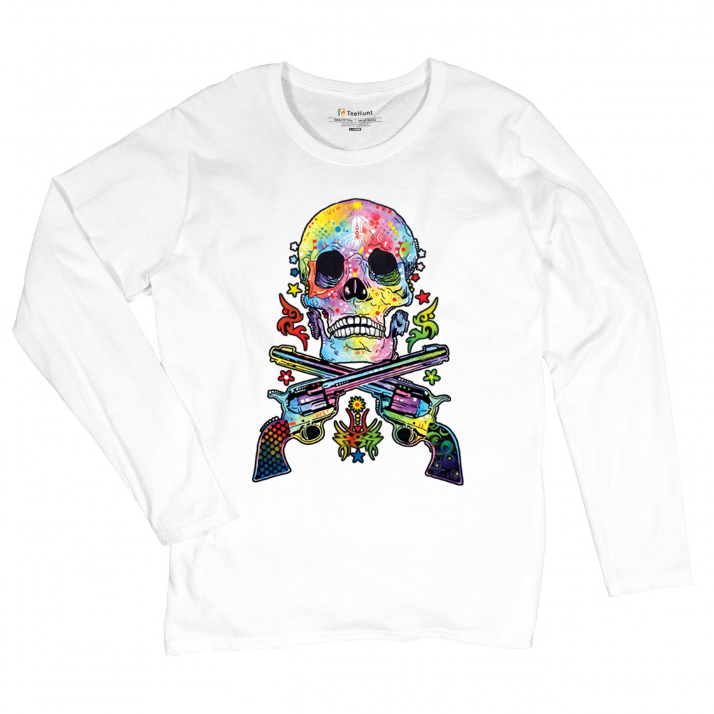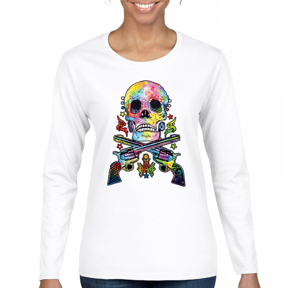 DEAN RUSSO ART SKULL AND GUNS women's long sleeve t-shirt colorful 2nd amendment white