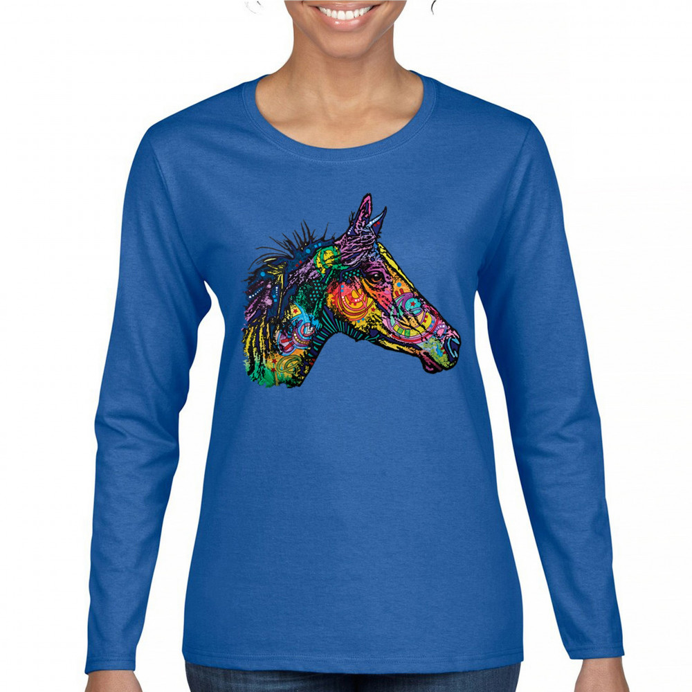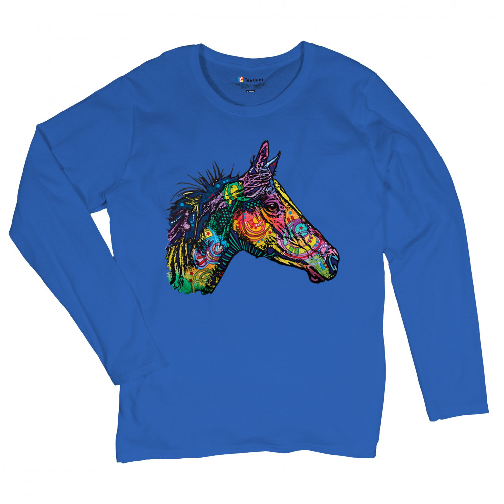DEAN RUSSO COLORFUL HORSE women's long sleeve t-shirt neon mosaic wild mustang royal blue