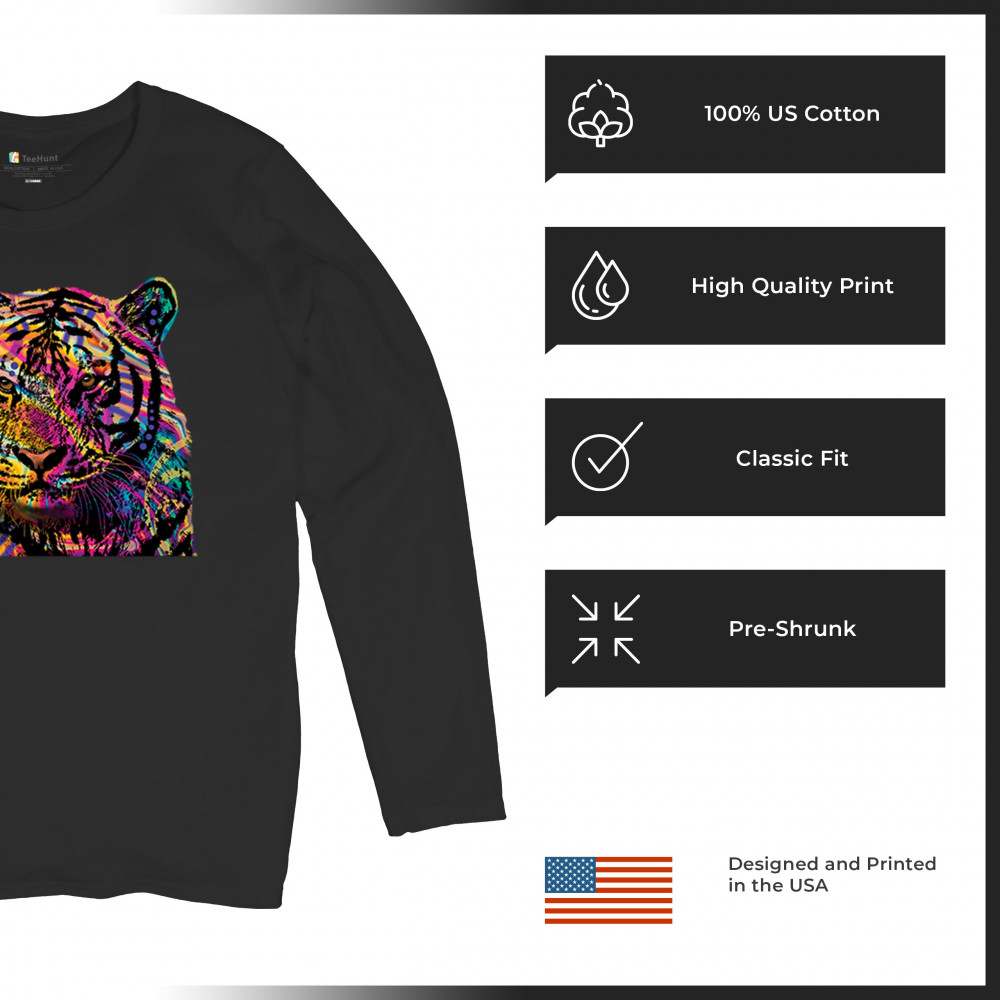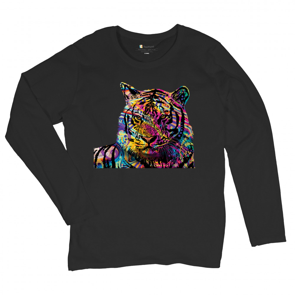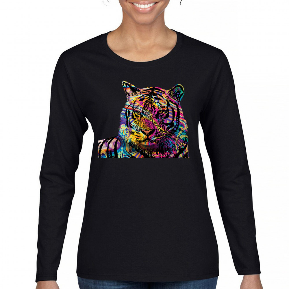 DEAN RUSSO COLORFUL NEON SIBERIAN TIGER women's long sleeve t-shirt wild big cat black