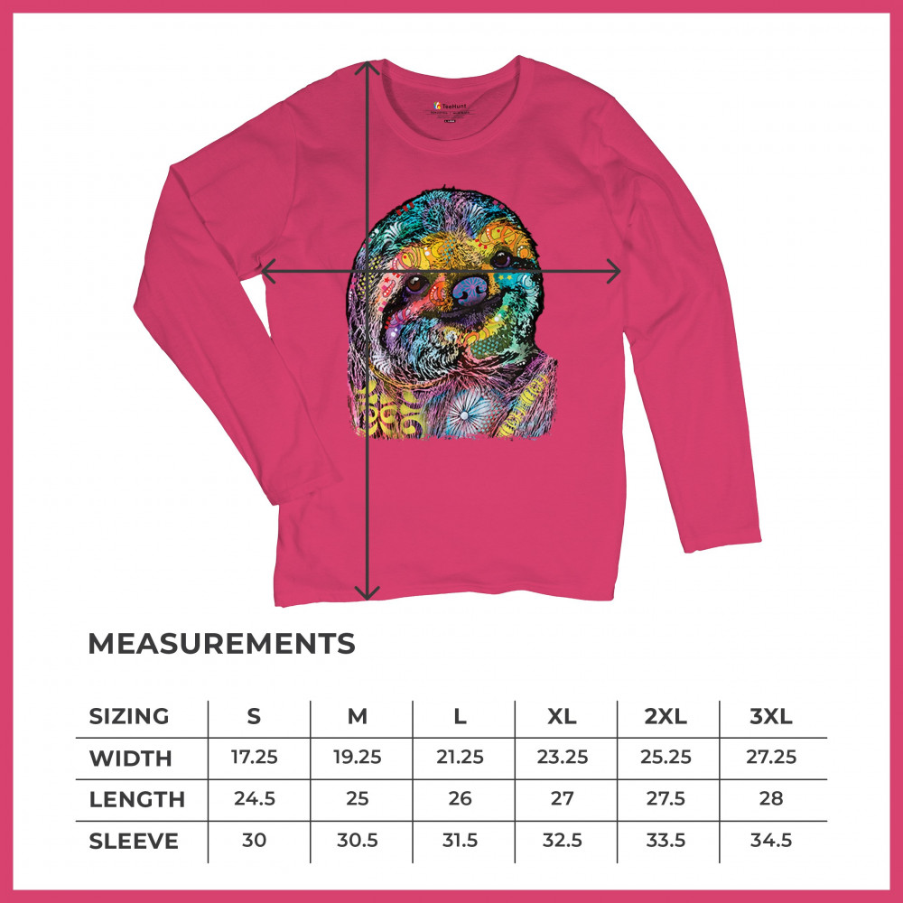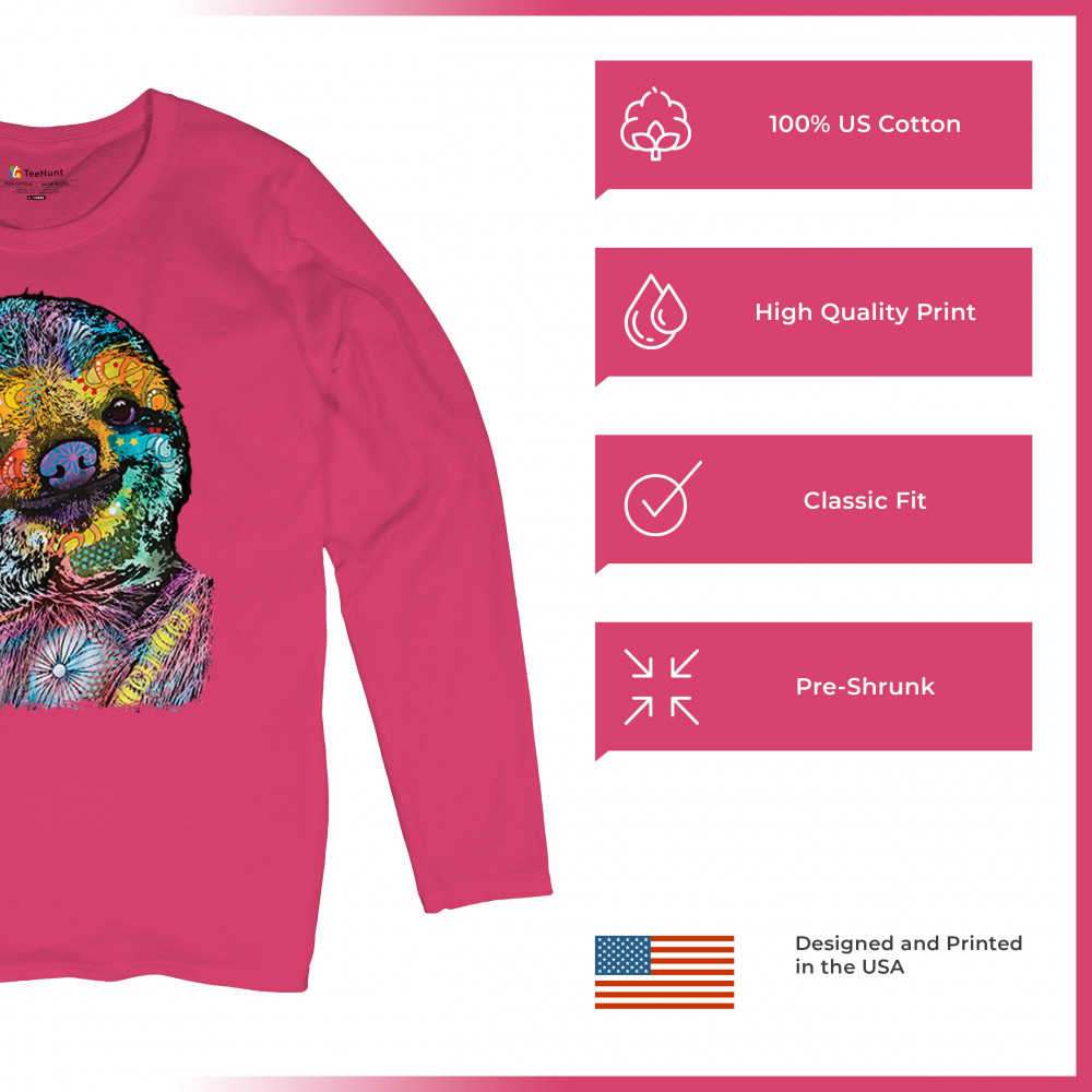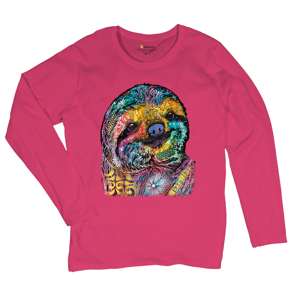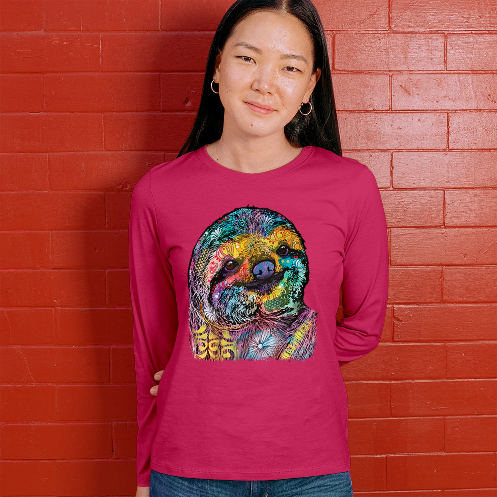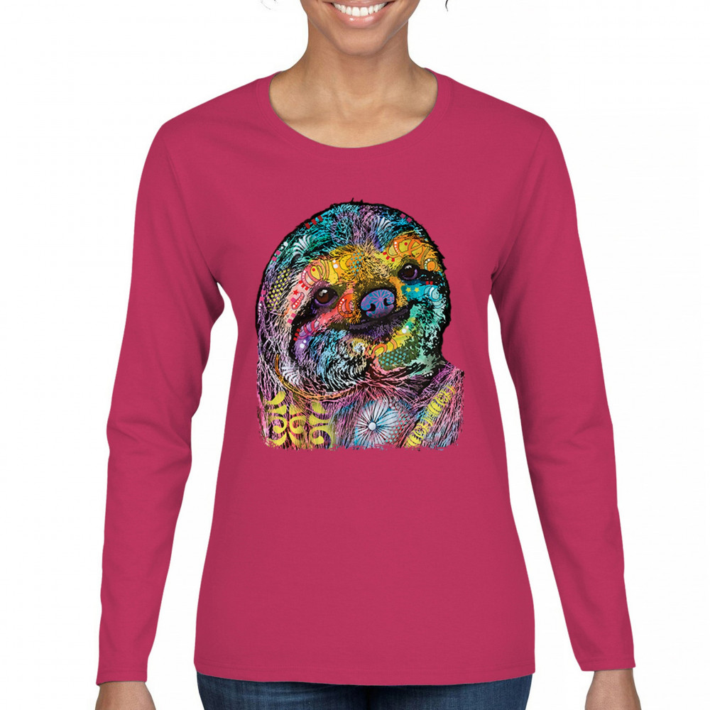 DEAN RUSSO CUTE LAZY SLOTH women's long sleeve t-shirt funny wild life colorful pink