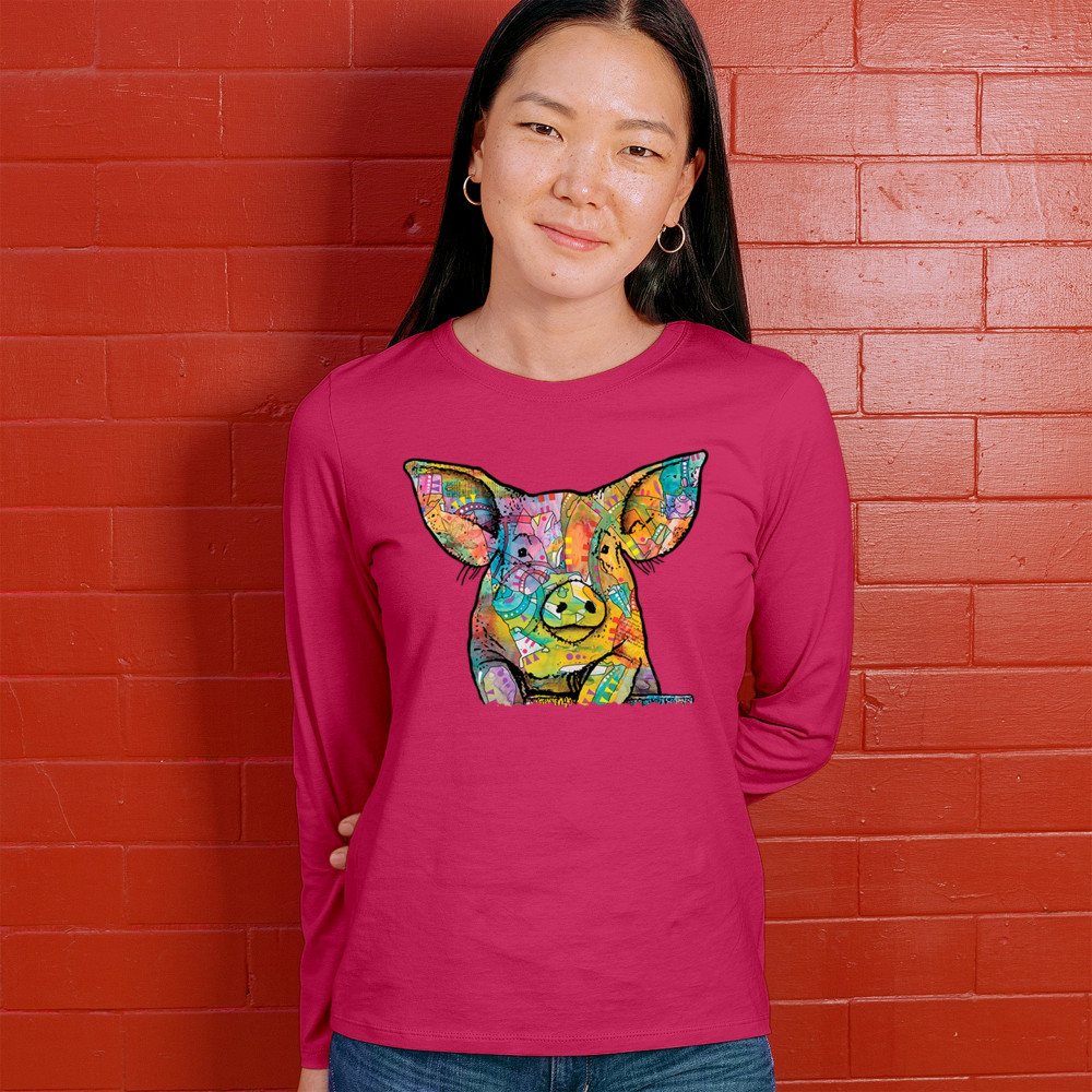 DEAN RUSSO FUNNY CUTE PIG women's long sleeve t-shirt farm piglet lover barn pink