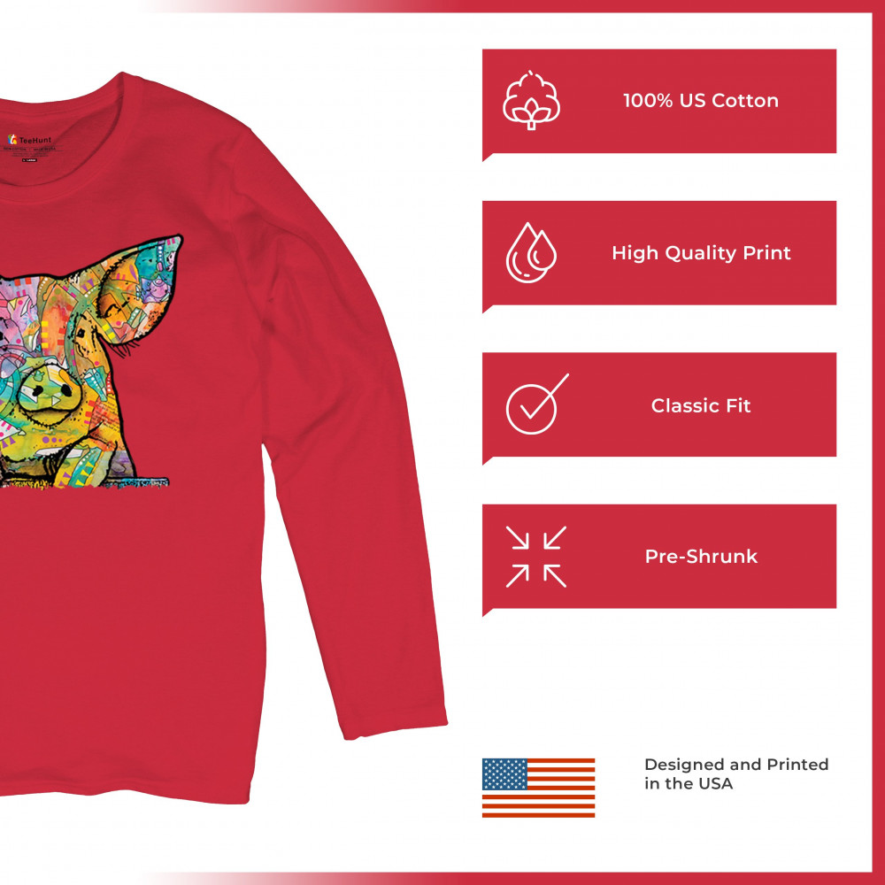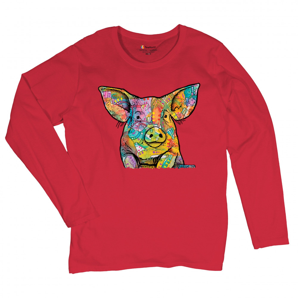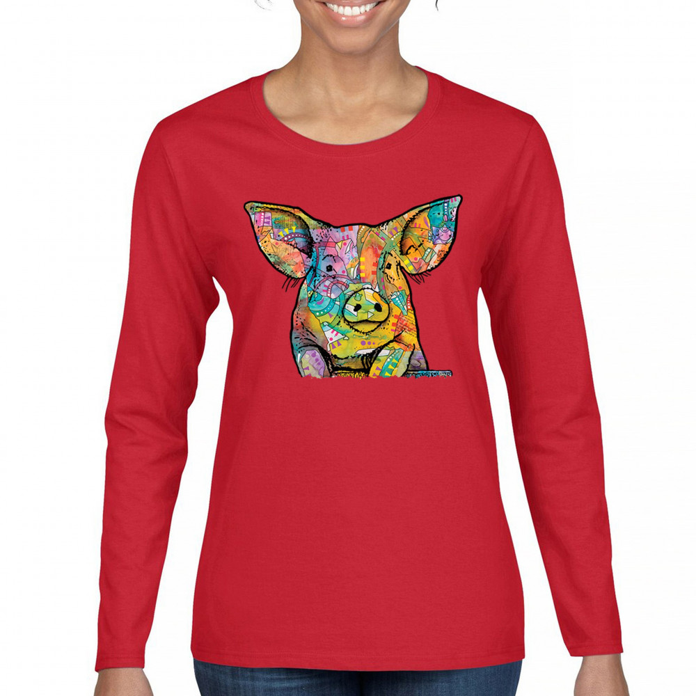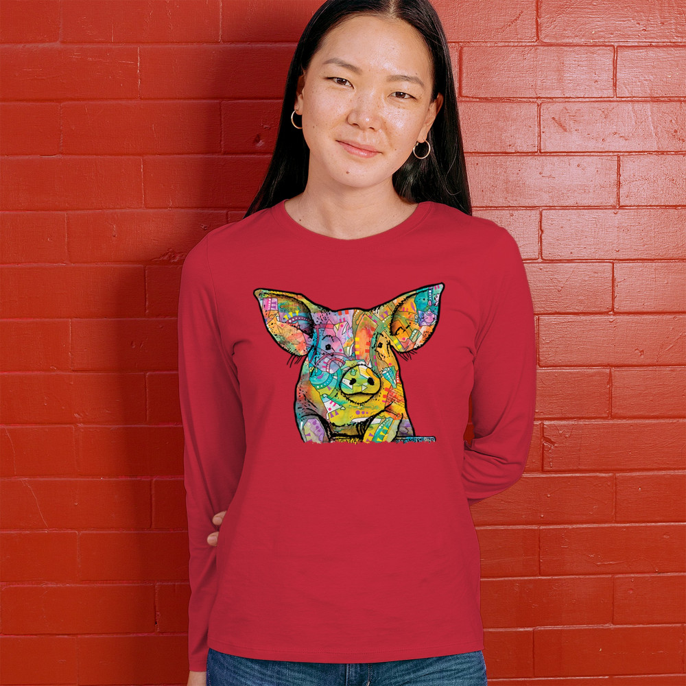 DEAN RUSSO FUNNY CUTE PIG women's long sleeve t-shirt farm piglet lover barn red