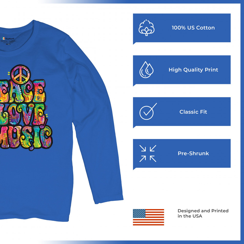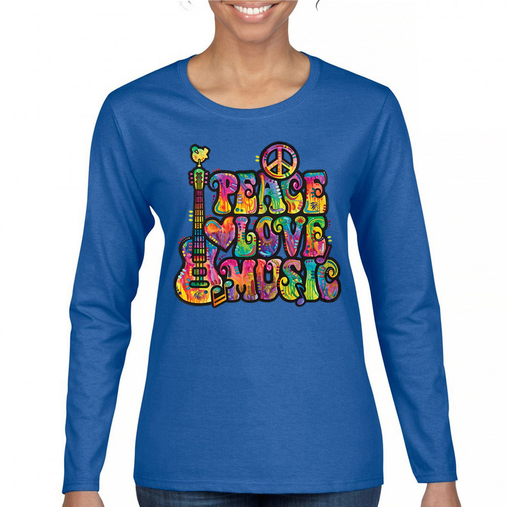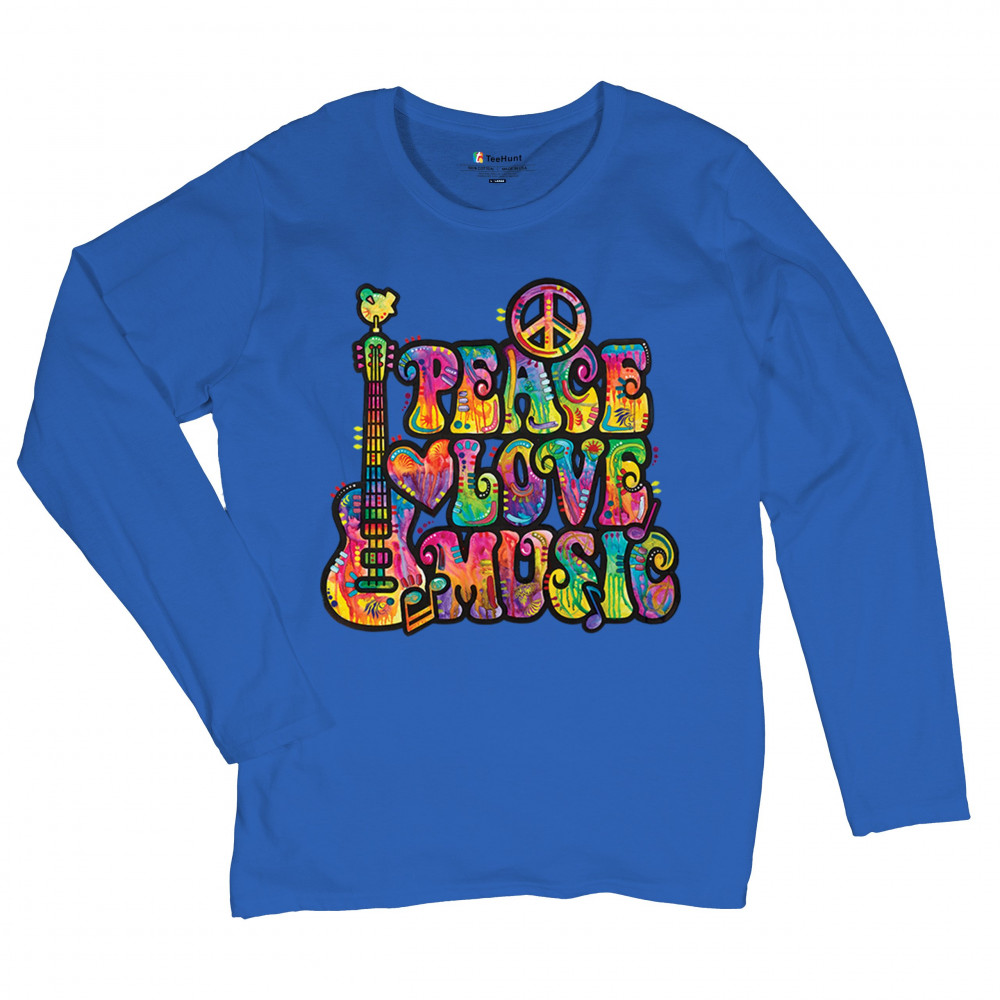 DEAN RUSSO PEACE LOVE MUSIC women's long sleeve t-shirt guitar happy good vibe royal blue