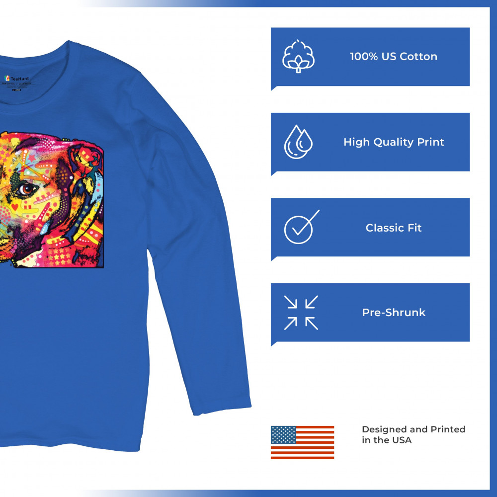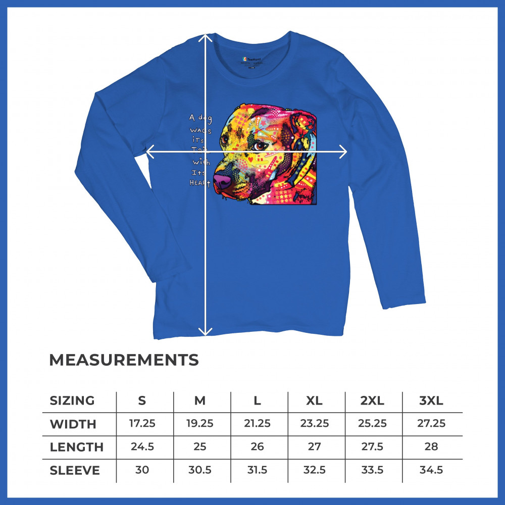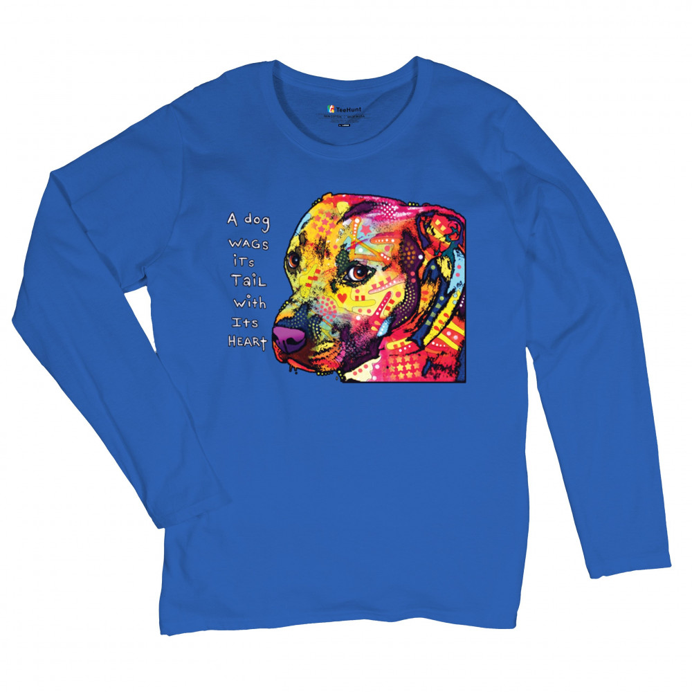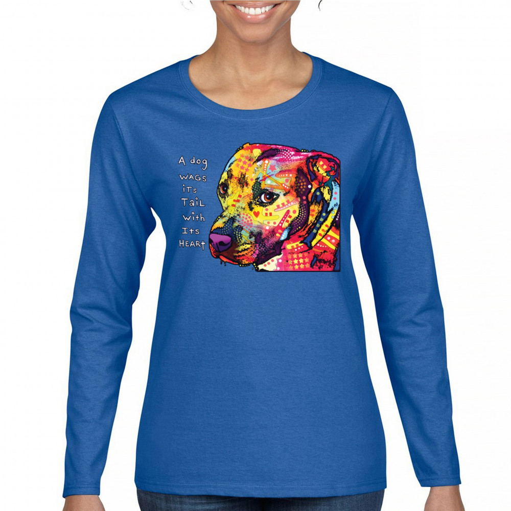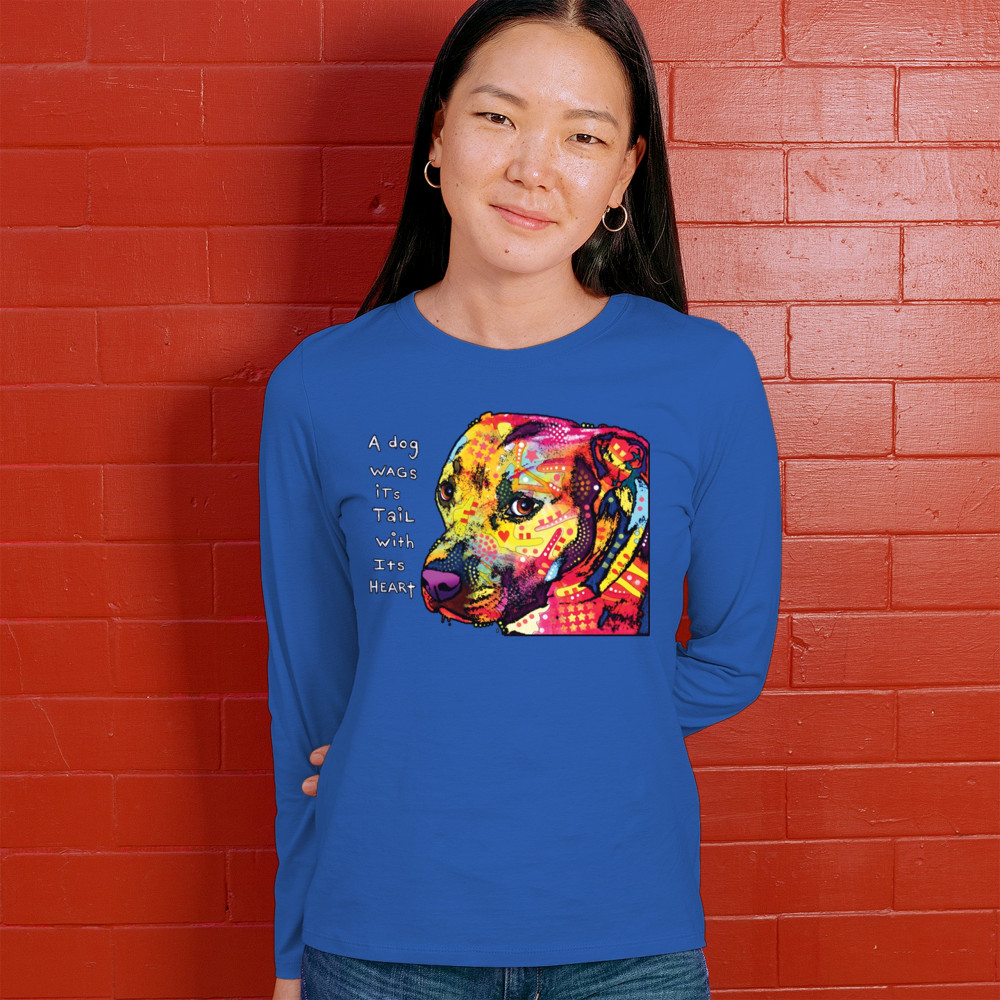 DEAN RUSSO PIT BULL women's long sleeve t-shirt a dog wags its tail with its heart royal blue