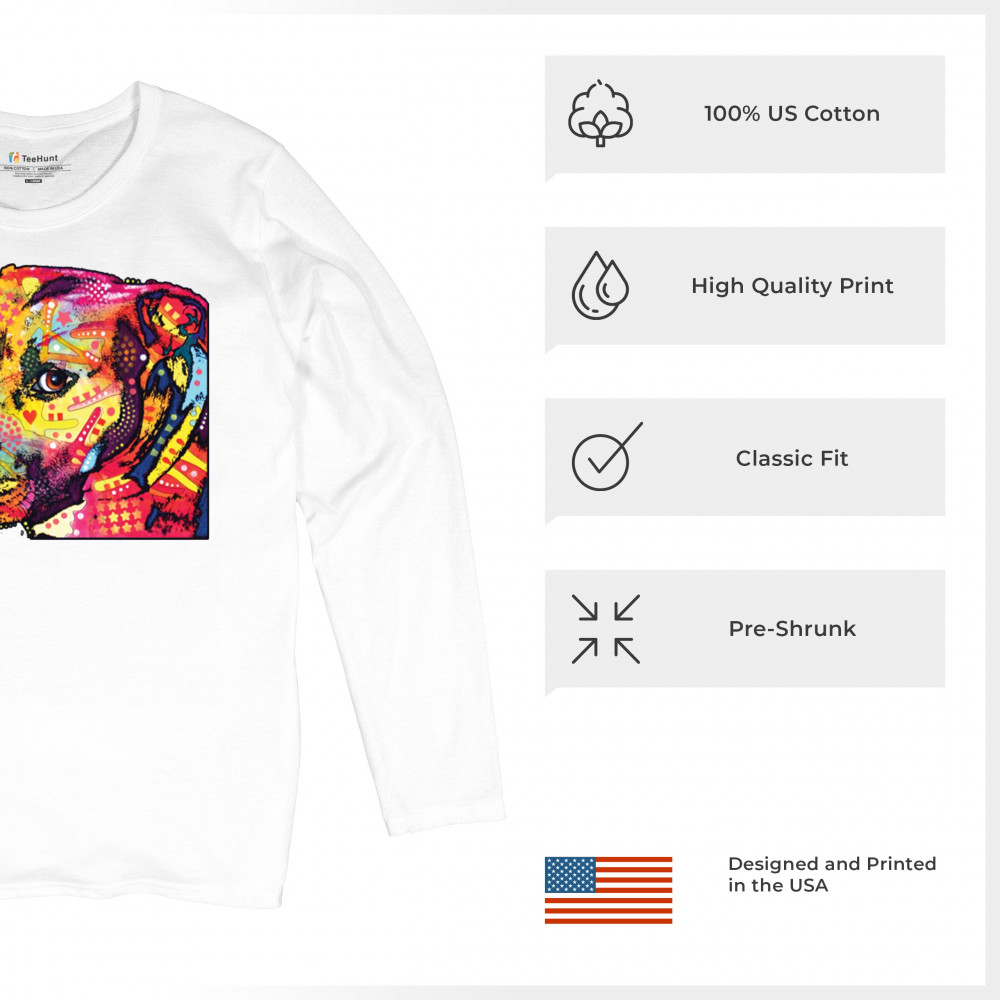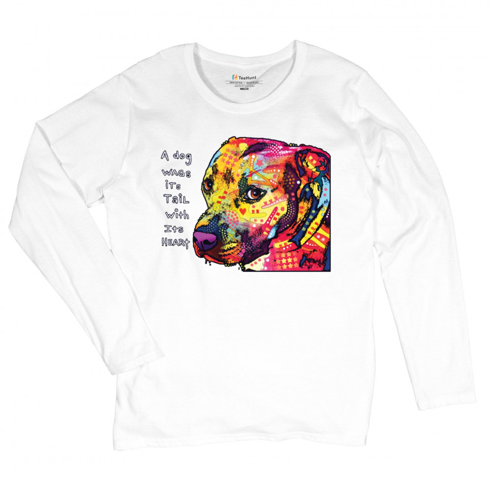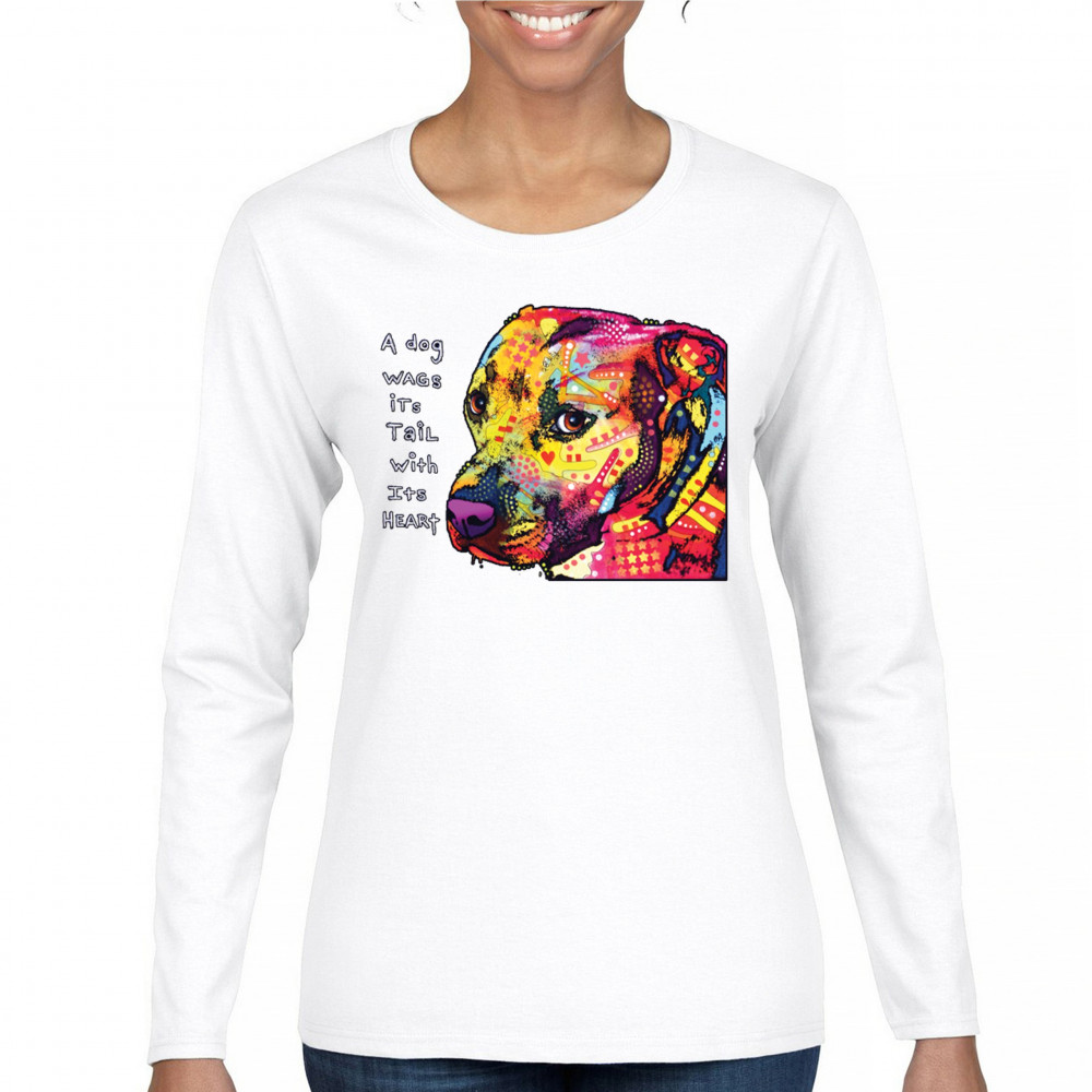 DEAN RUSSO PIT BULL women's long sleeve t-shirt a dog wags its tail with its heart white