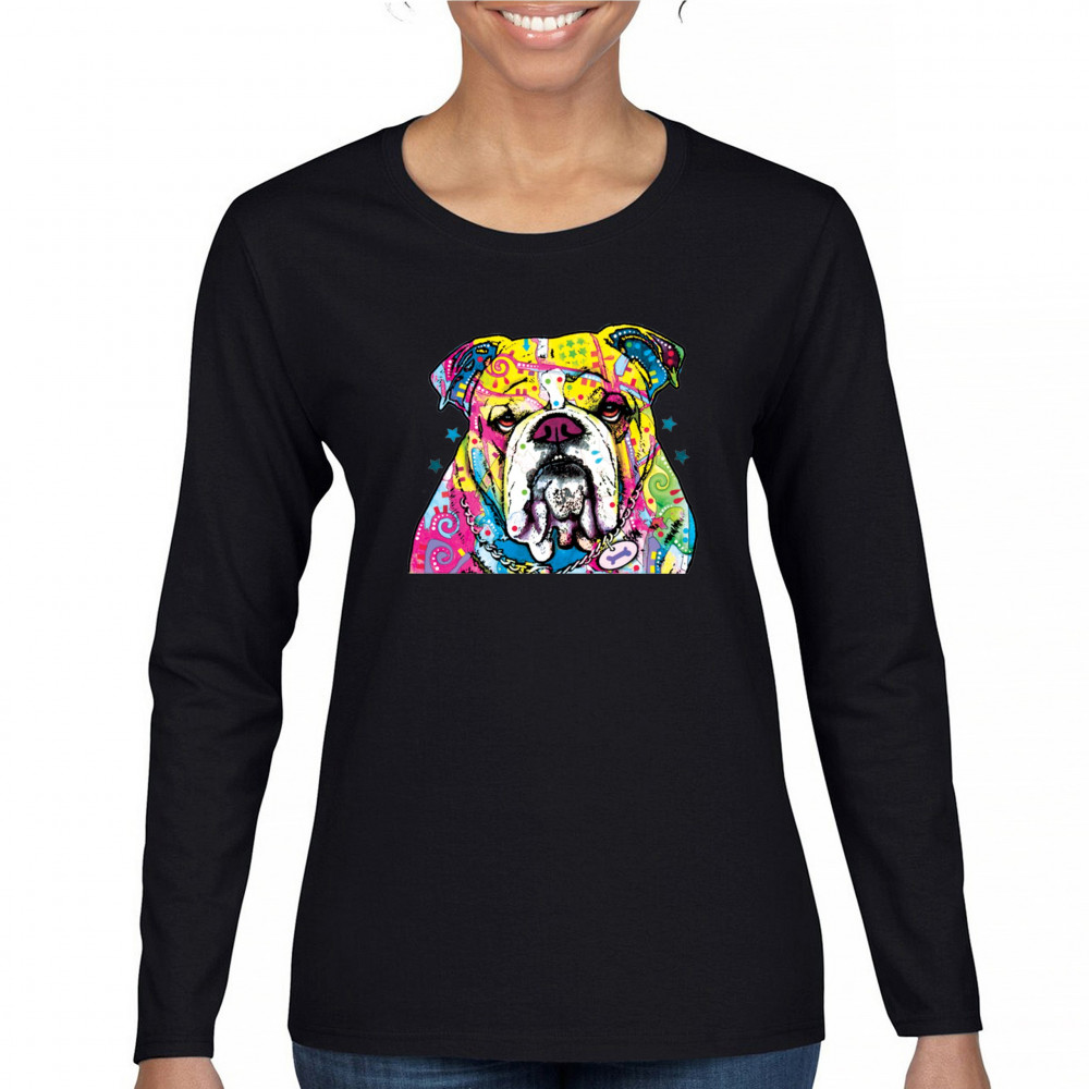 DEAN RUSSO SERIOUS BULLDOG women's long sleeve t-shirt colorful dog best friend black