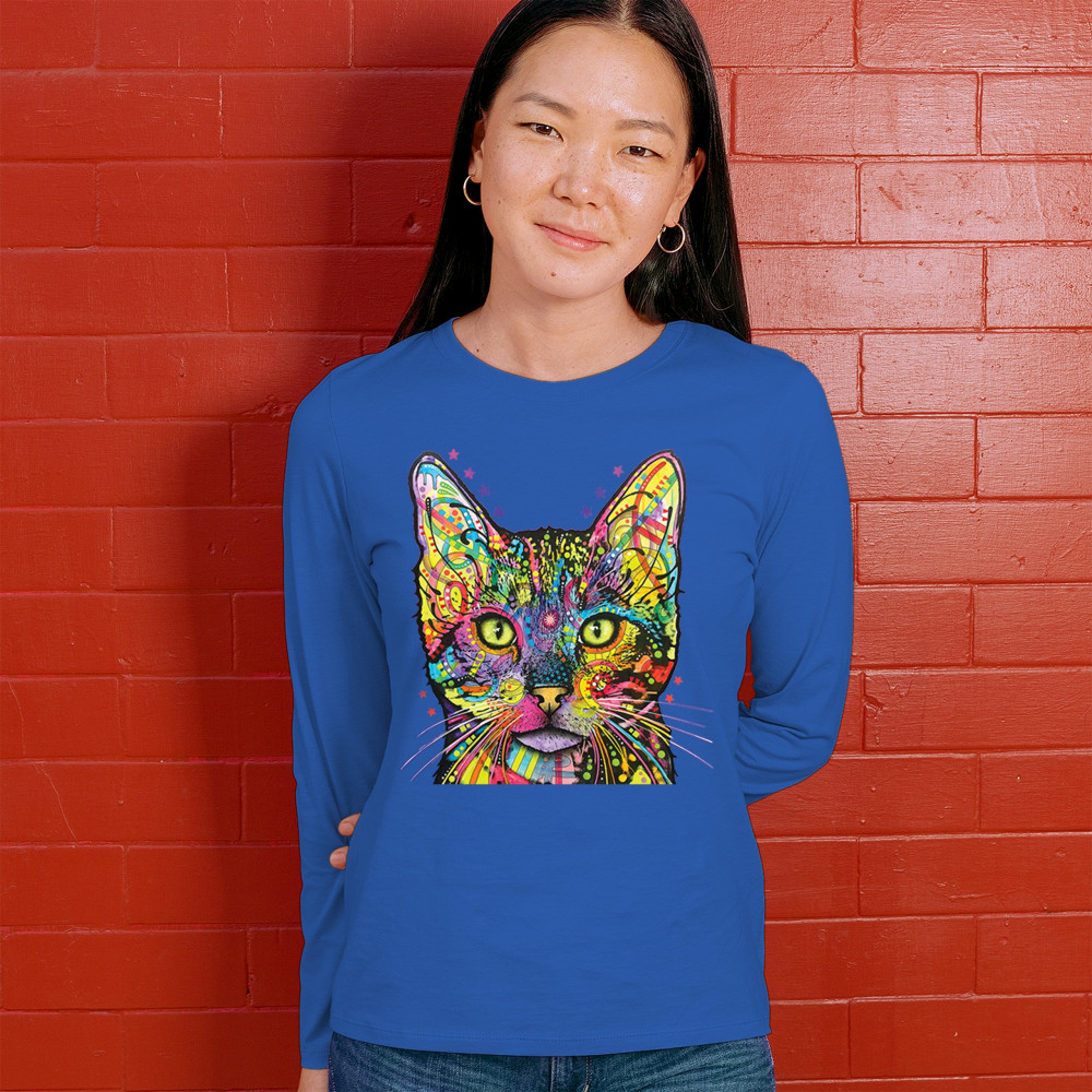 DEAN RUSSO SHIVA CAT STARE women's long sleeve t-shirt neon colorful kitten royal blue