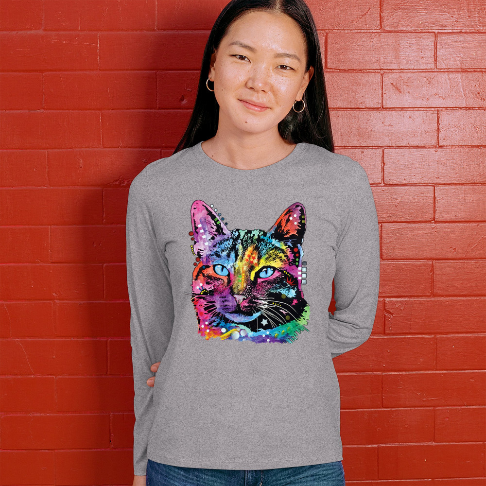 DEAN RUSSO THOUGHTFUL CAT women's long sleeve t-shirt colorful pet kitten eyes gray