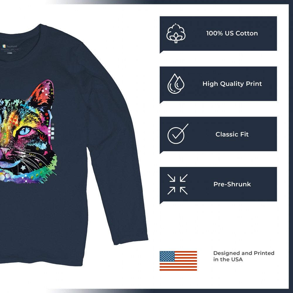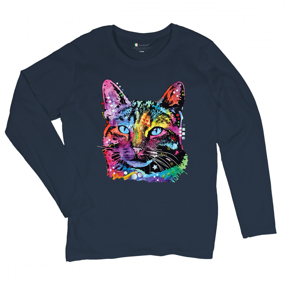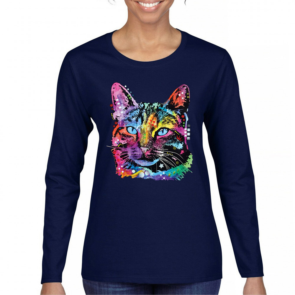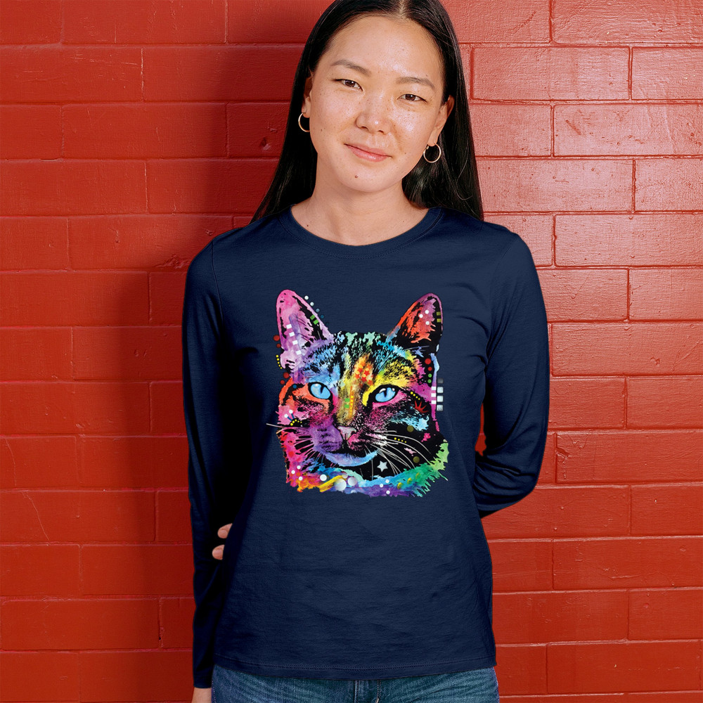 DEAN RUSSO THOUGHTFUL CAT women's long sleeve t-shirt colorful pet kitten eyes navy blue