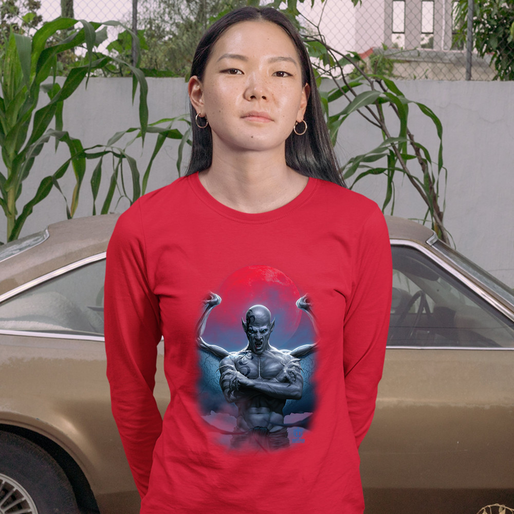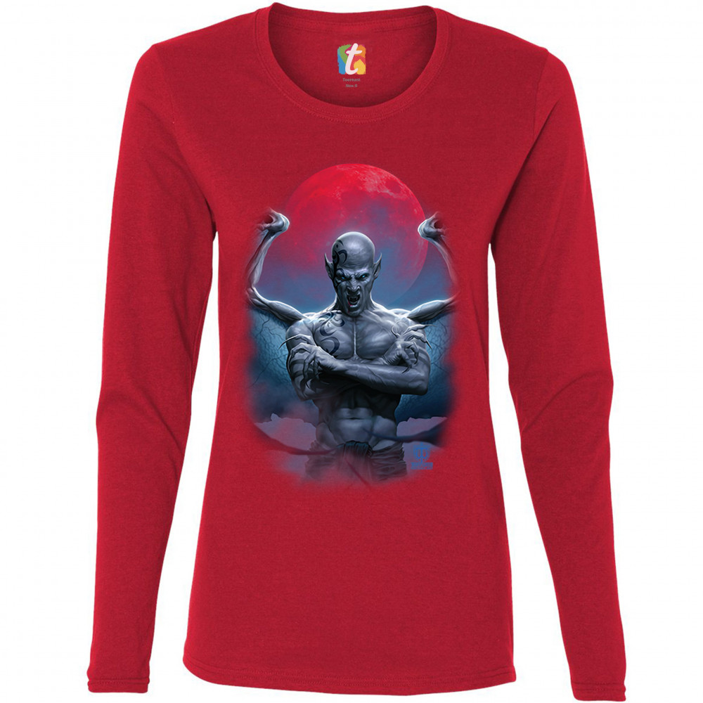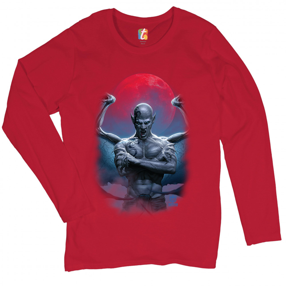 DEMON GARGOYLE women's long sleeve t-shirt blood moon scary halloween monster red