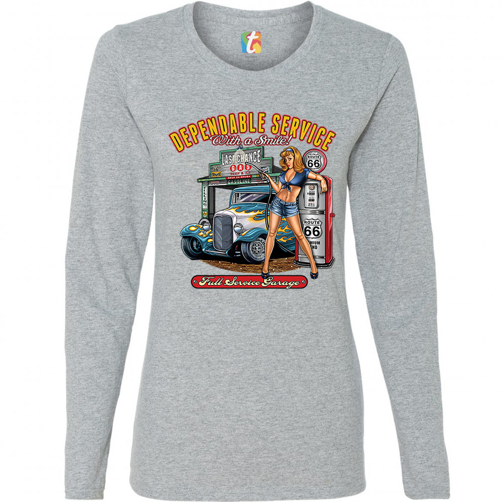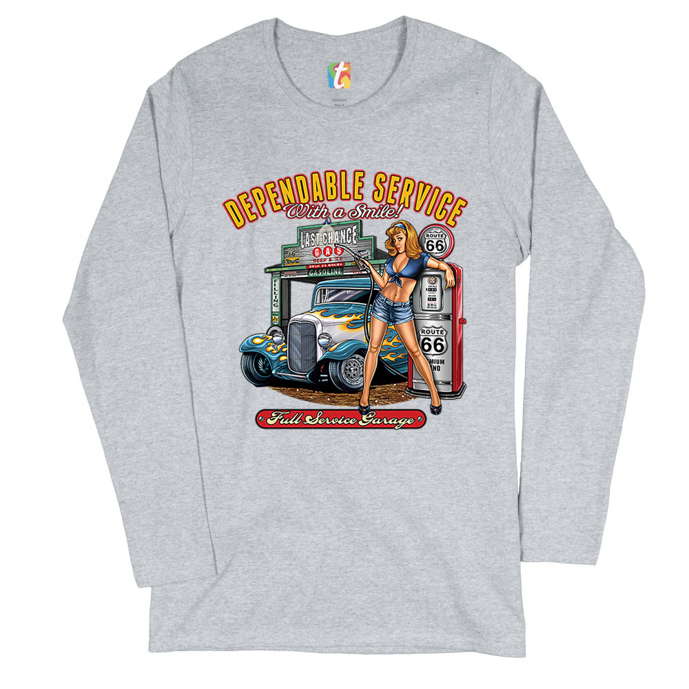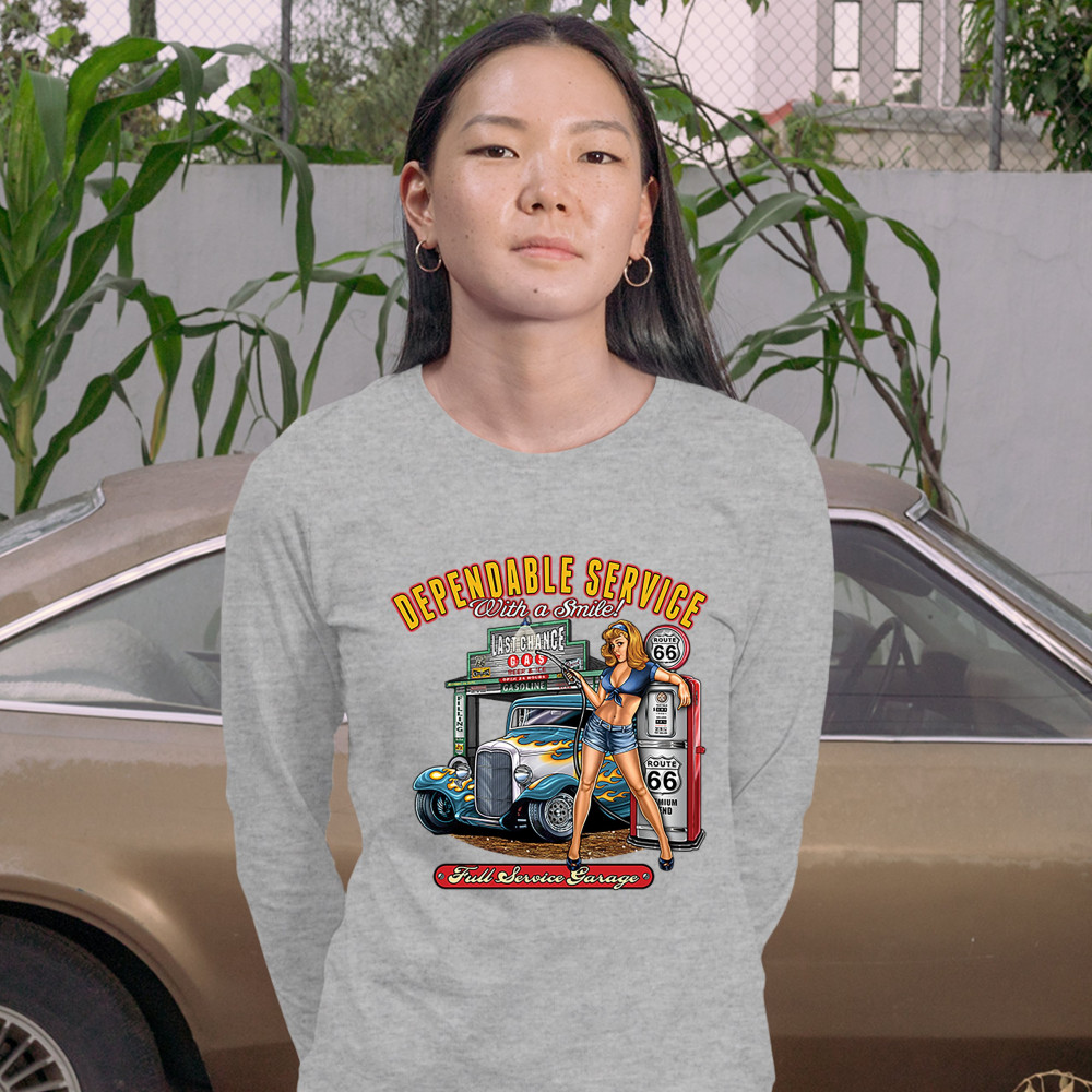 A print featuring a sexy pin-up girl standing by a gas pump with Route 66 signs on it. Behind her there is a garage with a hot rod parked at it. The print says: "Dependable Service With a Smile!" at the top and "Full Service Garage" at the bottom. A great