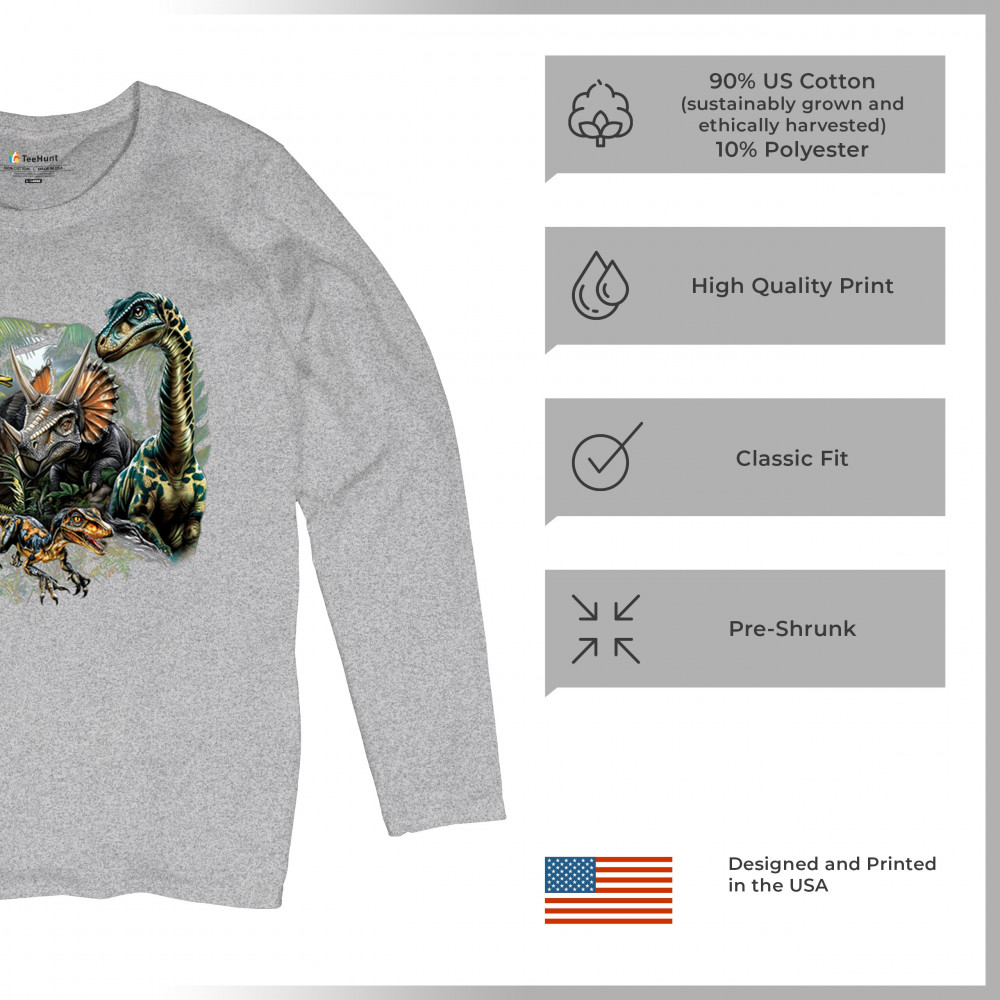 Bold jungle dinosaur design featuring t rex, triceratops, raptor, brachiosaurus, and pteranodon. Perfect for parties, digs, and dino fans.