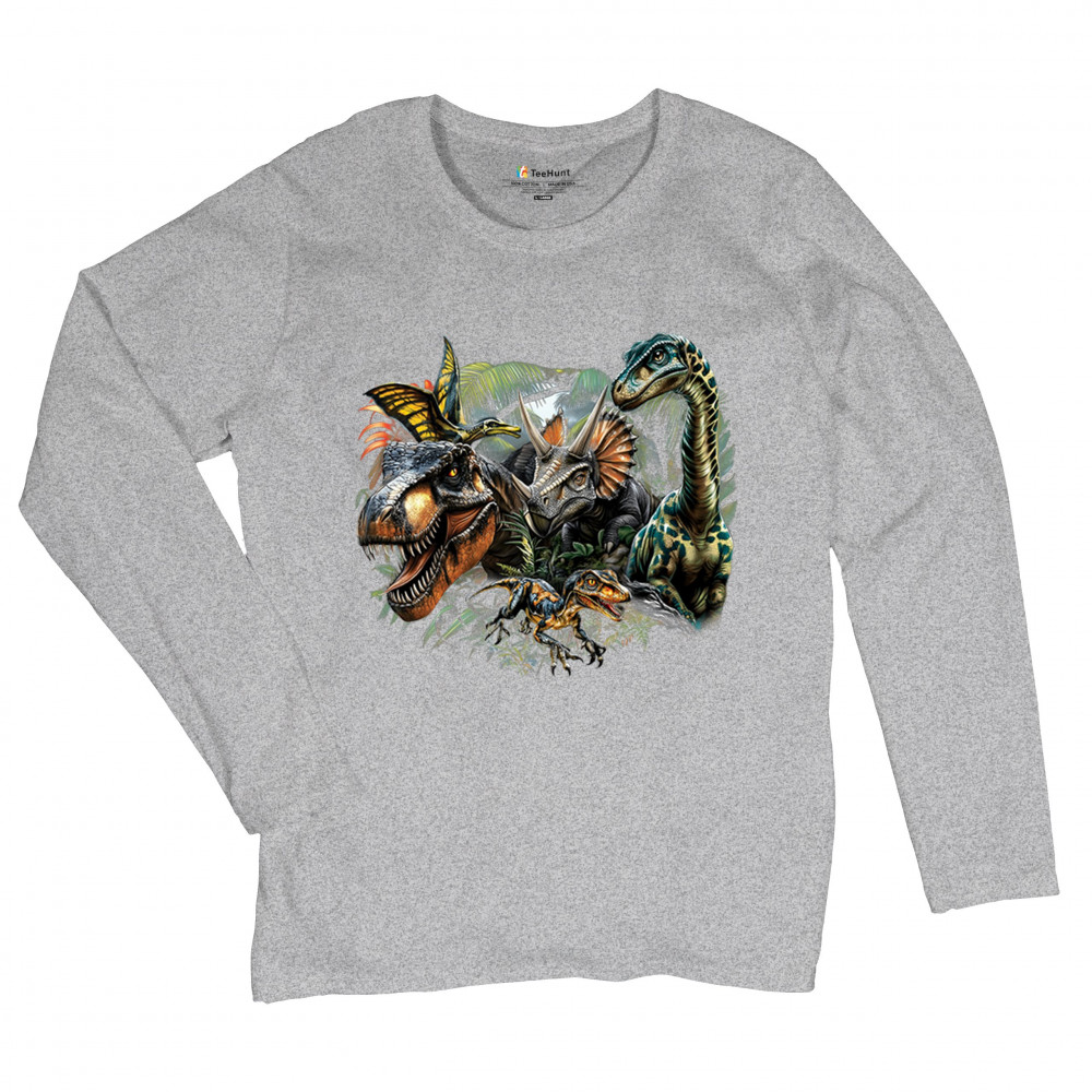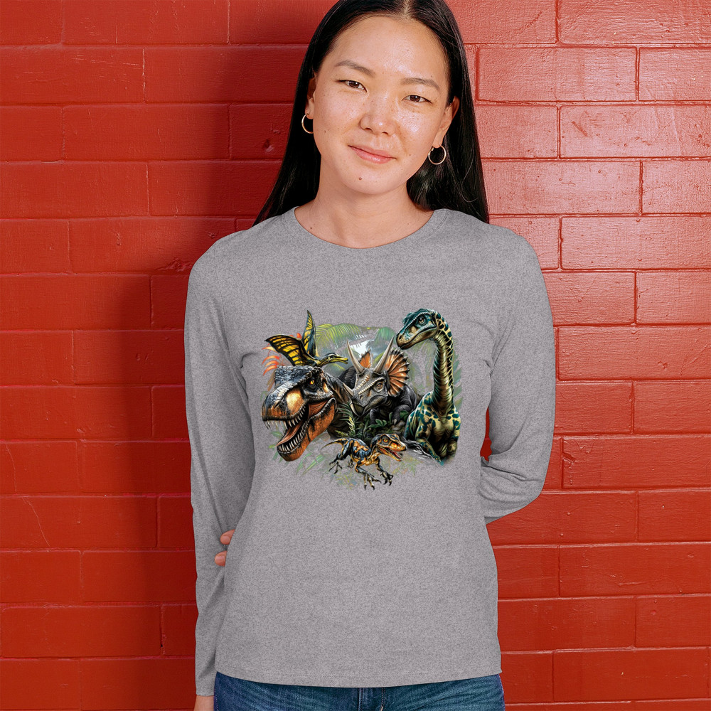 Get prehistoric with this electrifying design featuring a full dino squad in vibrant jungle detail. Includes t rex, triceratops, raptor, brachiosaurus, and pteranodon, all surrounded by tropical foliage. A perfect pick for dinosaur fans, fossil hunters, Jurassic birthday parties, or anyone who loves bold, wild, nature-themed art.