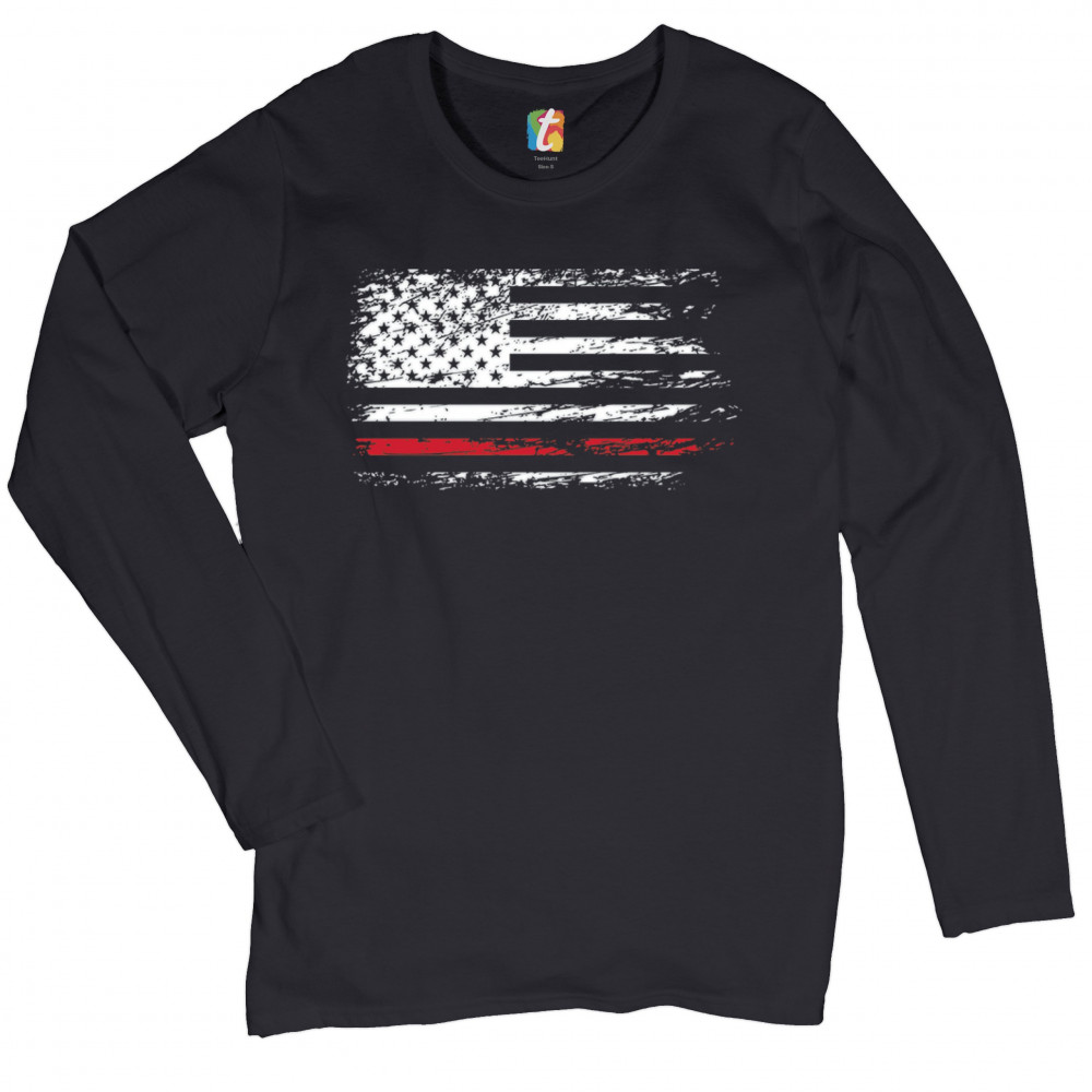 DISTRESSED AMERICAN FLAG women's long sleeve t-shirt thind red line firefighter black