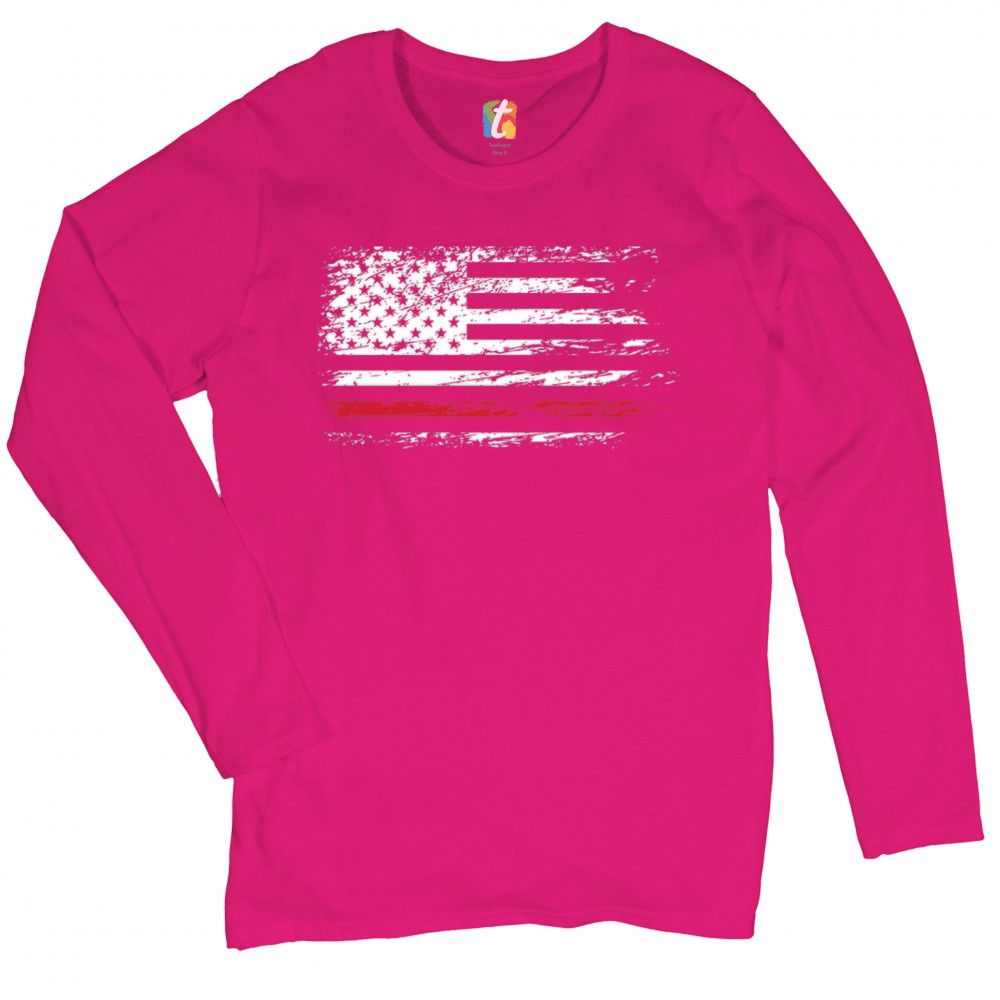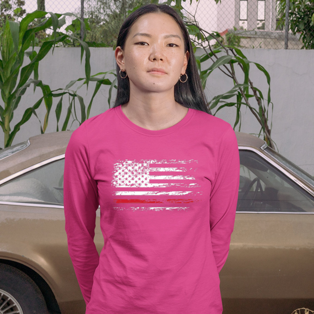 DISTRESSED AMERICAN FLAG women's long sleeve t-shirt thind red line firefighter pink